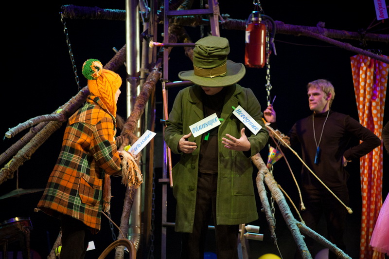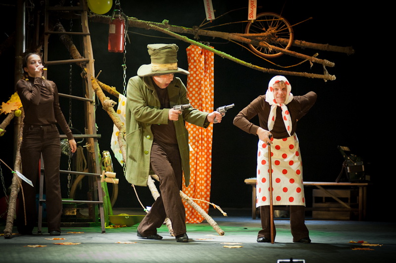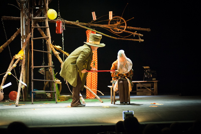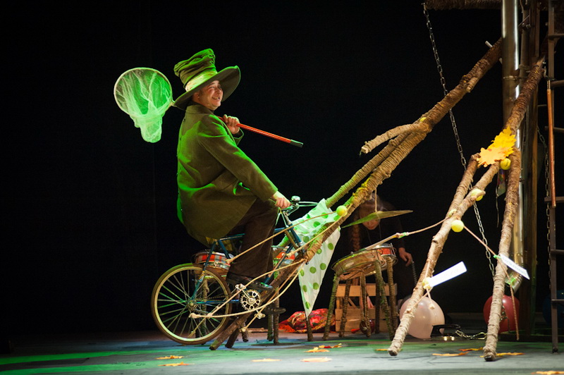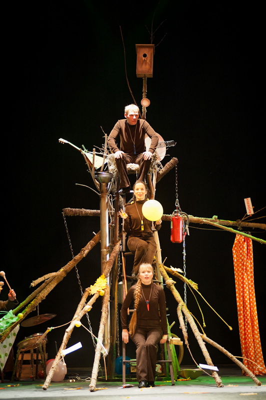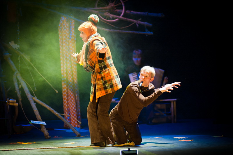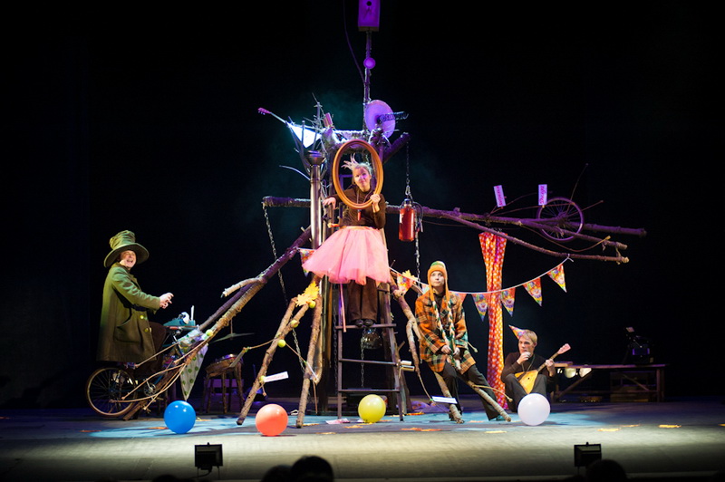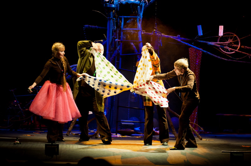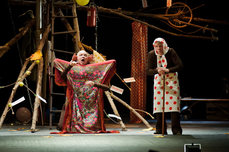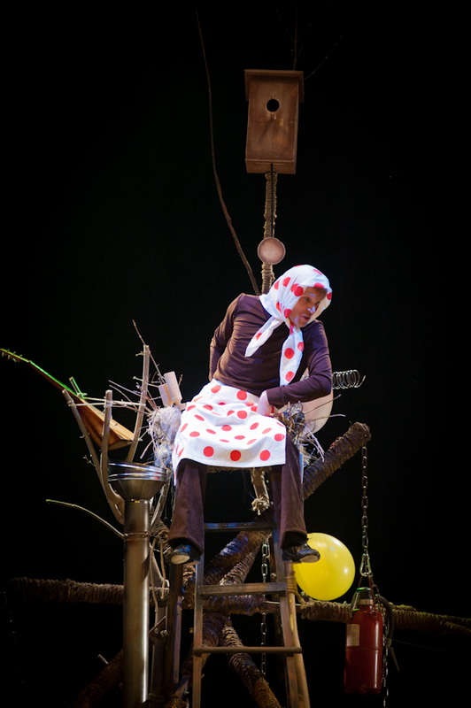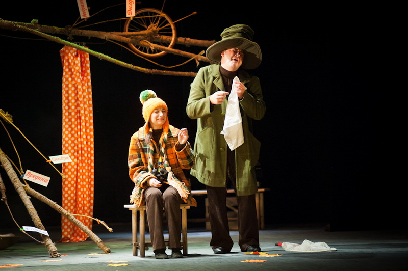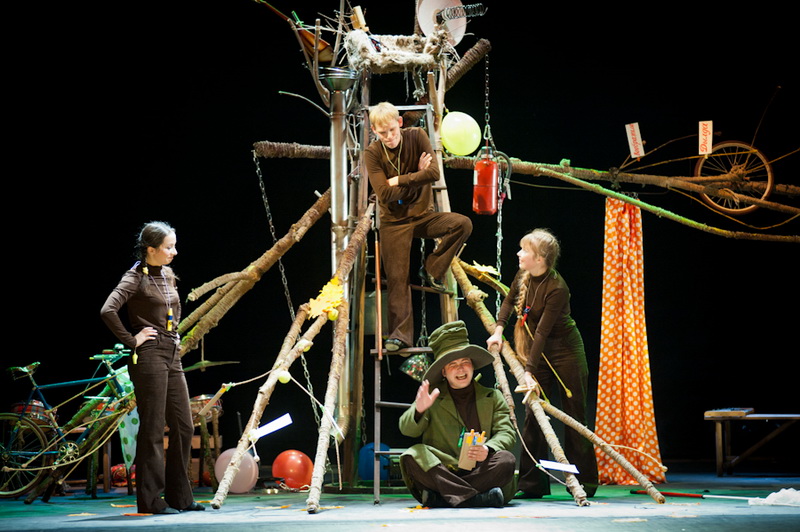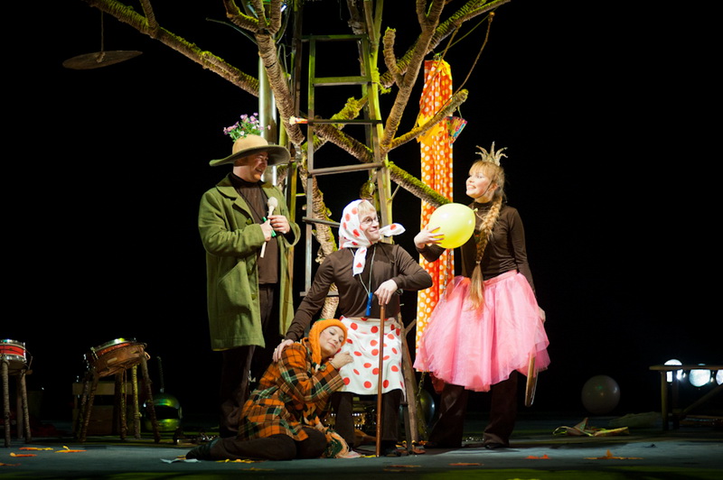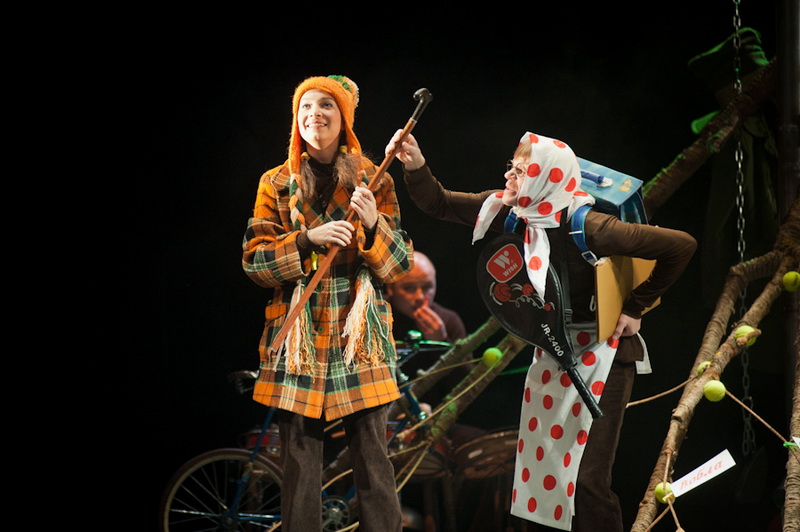 Может быть, мам и пап не очень увлекут перипетии сюжета, зато им, безусловно, будет интересно поразглядывать весьма нетипичный интерьер сцены, ибо назвать банальным словом «декорация» то, что нагородил тут художник, язык не поворачивается. Странная подвижная химера из дерева, велосипеда, гнезда, скворечника, водосточной трубы, противогаза, кучи музыкальных инструментов, записок, шариков, листьев, яблок, антенн и платков тянет на отдельного полноценного персонажа. Именно вокруг него будет разыгрываться психологическая, но, в общем-то, забавная история о сбежавшей бабушке и капризной внучке, и конец непременно будет счастливым.