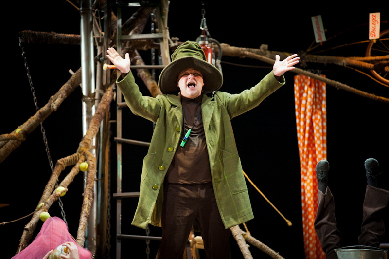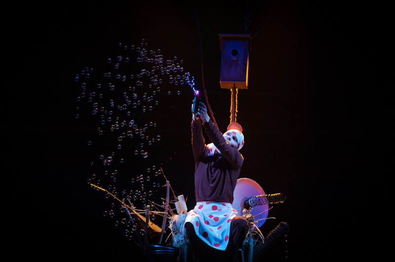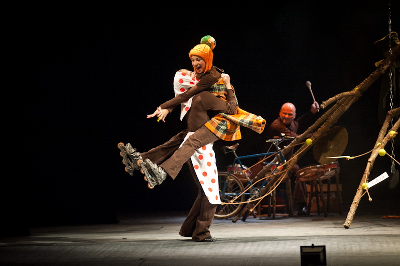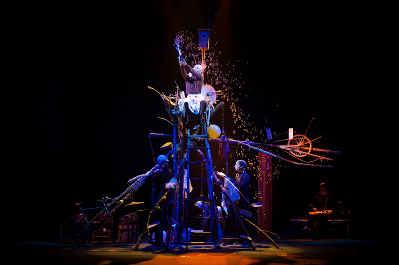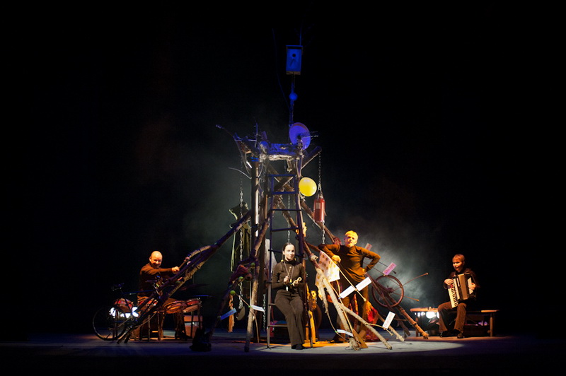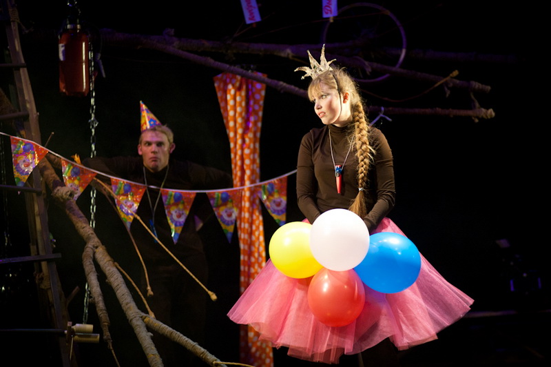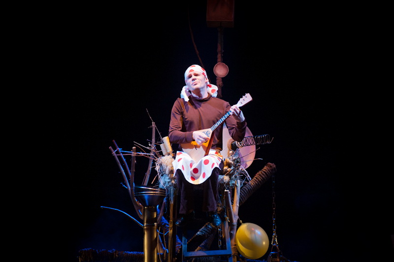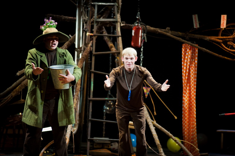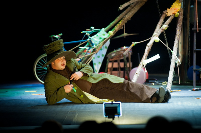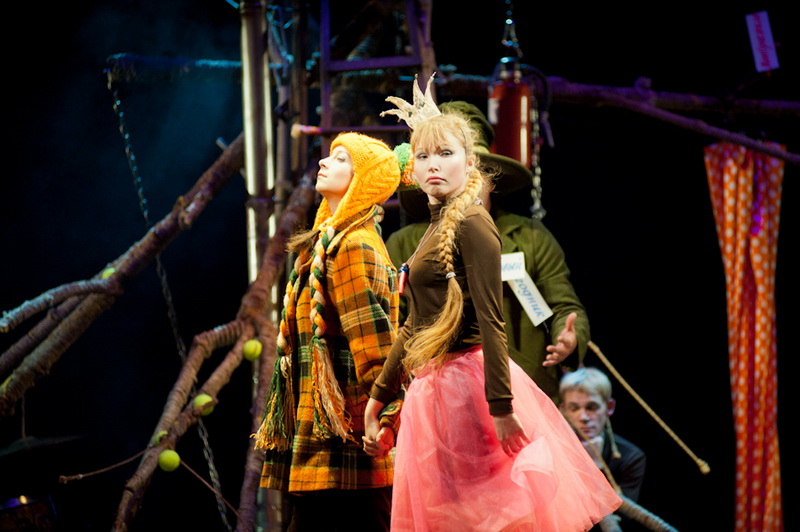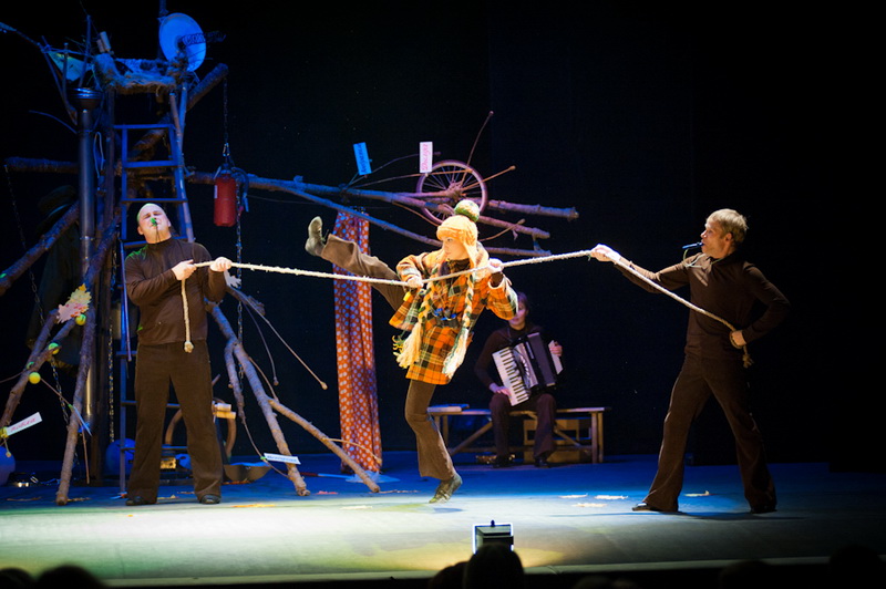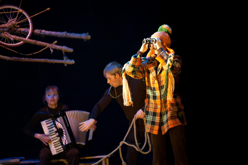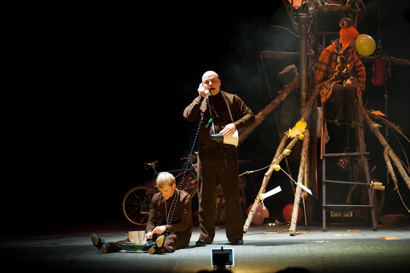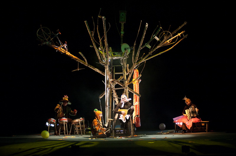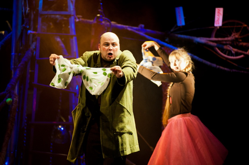 Может быть, мам и пап не очень увлекут перипетии сюжета, зато им, безусловно, будет интересно поразглядывать весьма нетипичный интерьер сцены, ибо назвать банальным словом «декорация» то, что нагородил тут художник, язык не поворачивается. Странная подвижная химера из дерева, велосипеда, гнезда, скворечника, водосточной трубы, противогаза, кучи музыкальных инструментов, записок, шариков, листьев, яблок, антенн и платков тянет на отдельного полноценного персонажа. Именно вокруг него будет разыгрываться психологическая, но, в общем-то, забавная история о сбежавшей бабушке и капризной внучке, и конец непременно будет счастливым.