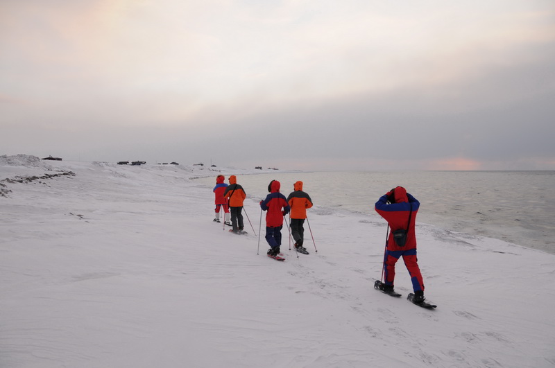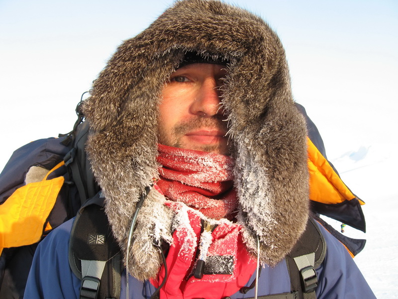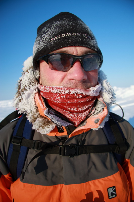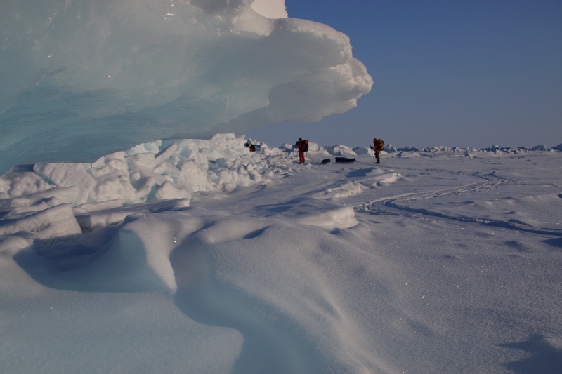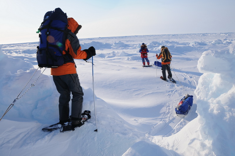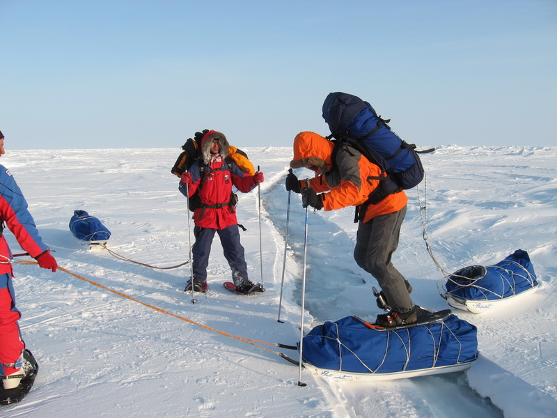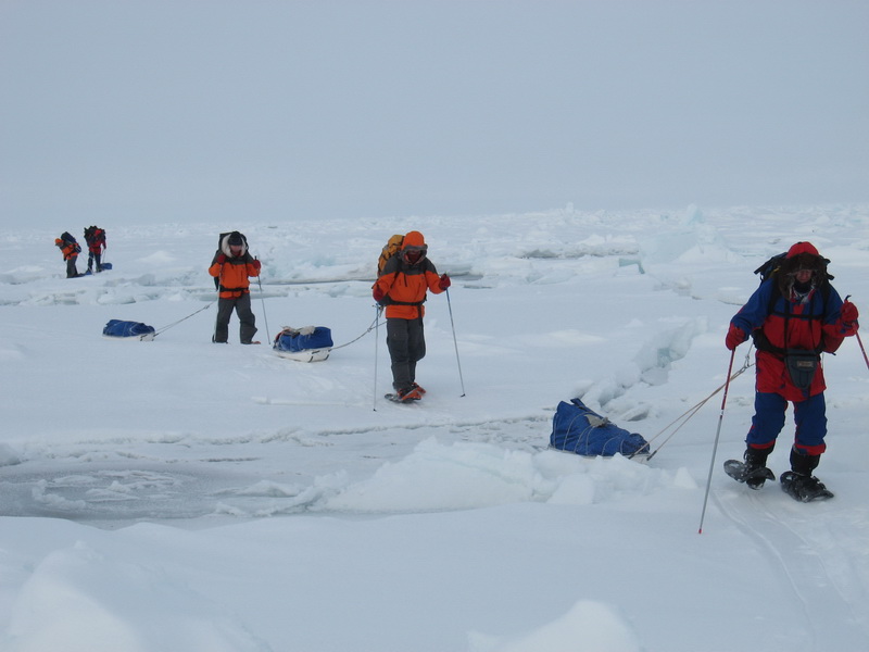 …Преодолели ещё 15 километров, сильный ветер, видимость 2–3 метра, мороз+ветер (-45 градусов). Много торосов, два участка с открытой водой — тяжелые!