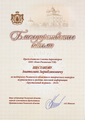 В январе 2011 года прошел очередной конкурс «Хрустальный журавль», партнером которого по сложившейся традиции выступила и Ново-Рязанская ТЭЦ. За поддержку проведения областного творческого конкурса журналистов и средств массовой информации «Хрустальный журавль — 2010» председатель Совета директоров ООО «Ново-Рязанская ТЭЦ» Анатолий Шестаков получил благодарственное письмо от вице-губернатора, первого заместителя председателя правительства Рязанской области Андрея Шевелёва.