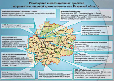 Инвестиционный климат в регионе становится все более благоприятным. В последние годы отмечается устойчивый рост инвестиций в развитие агропромышленного комплекса. За 2008-2011 годы в Рязанской области на развитие АПК направлено 17 миллиардов рублей, из них на развитие предприятий пищевой и перерабатывающей промышленности — 5,3 миллиарда рублей. Суммарная стоимость реализуемых в настоящее время в регионе инвестиционных проектов — свыше 13 миллиардов рублей.