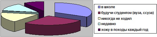 Как и общественный транспорт, пешие прогулки на природе и походы у современных рязанцев не популярны. 33,4% из общего числа респондентов вспомнили, что последний раз ходили в поход ещё в школьные годы, 27,4% — во времена студенчества, 13,1% — недавно. Никогда не ходили в поход 17,1% принявших участие в опросе горожан. И только 9% опрошенных заявили, что ходят в походы каждый год.