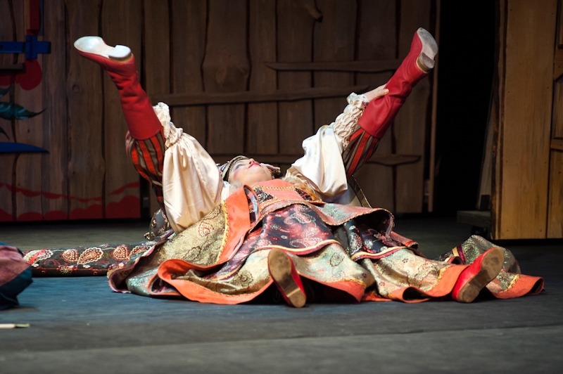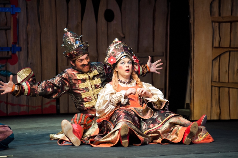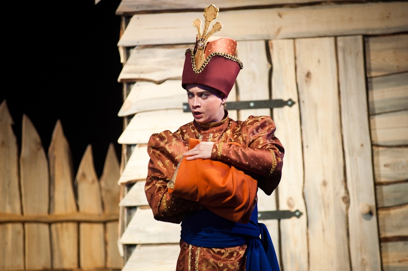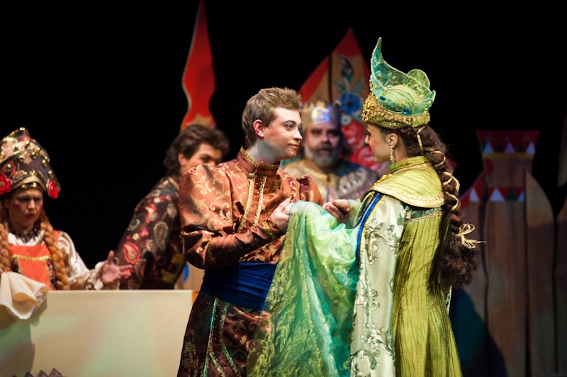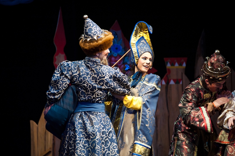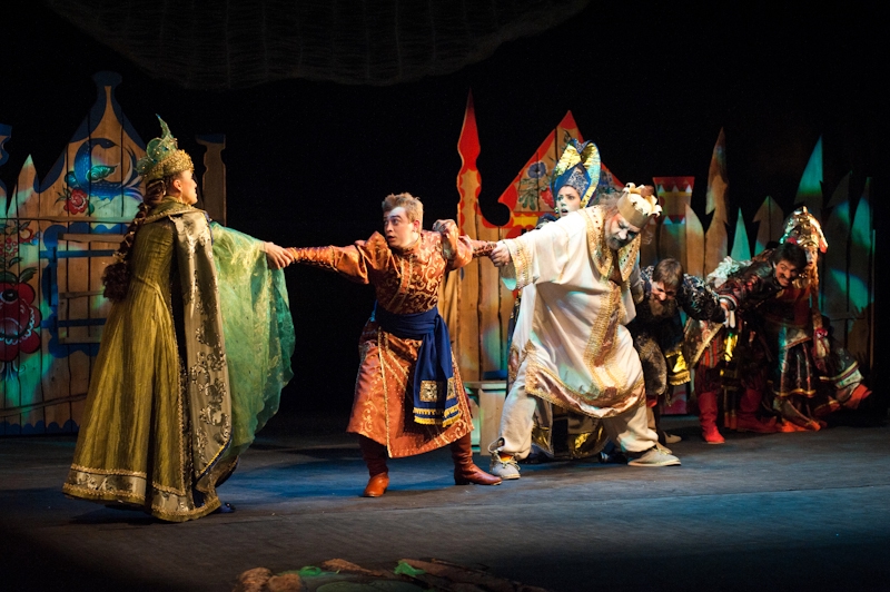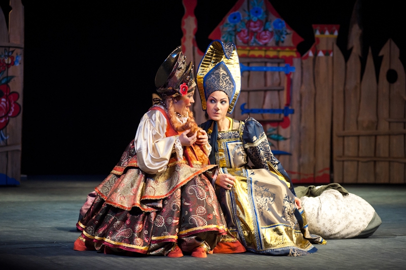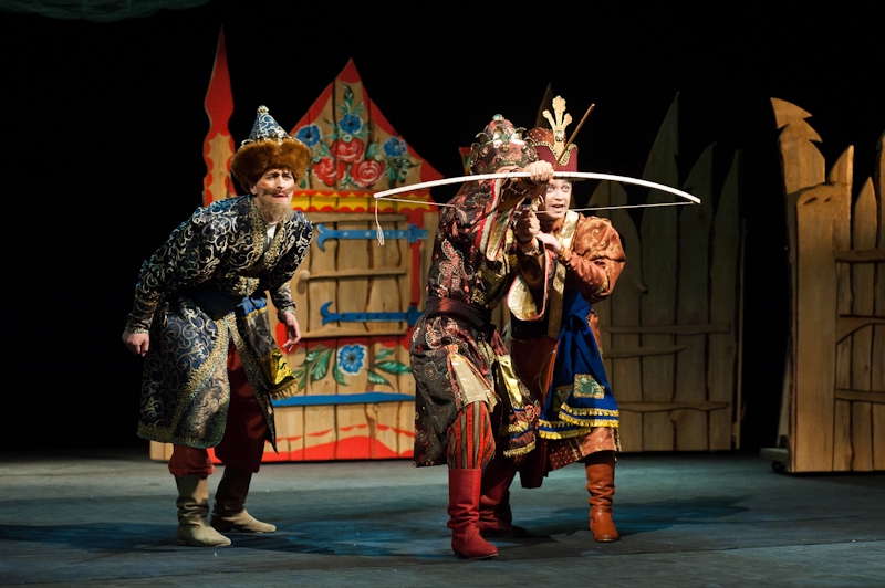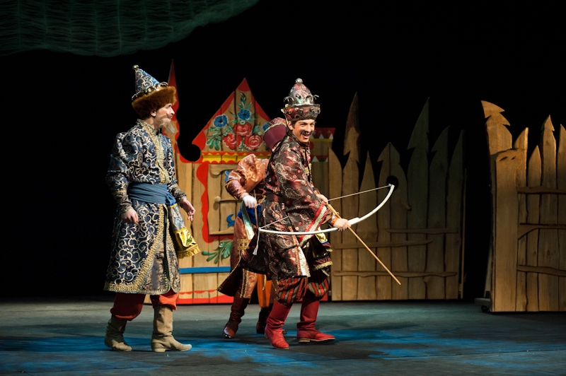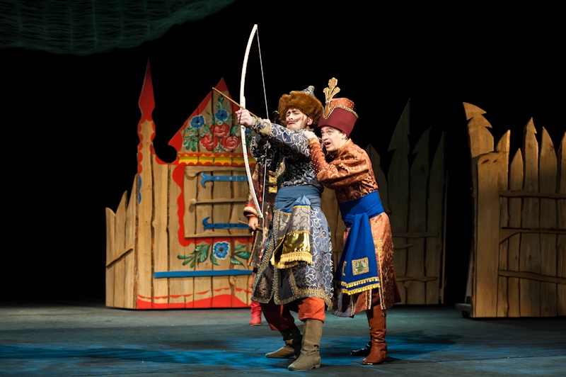 Сказочность происходящего на сцене поддерживают потрясающие костюмы Юлии Ксензовой, своей затейливостью напоминающие иллюстрации Билибина — ещё одного классика в мире русских народных сказок. От дерюги колоритного бородатого старца-рассказчика до богатого наряда волшебницы Василисы, переливающегося всеми оттенками зелёного, или роскошного костюма Кощея, таинственно мерцающего золотом из тьмы, царящей в его царстве. Артисты в этих костюмах не просто гордо дефилируют по сцене, а танцуют, припрыгивают, дерутся, падают и даже поют, что, в принципе, свойственно труппе театра на Соборной. Татьяна Яковлева, выступившая балетмейстером спектакля, расслабиться молодым (и не очень) артистам не даёт: то на высоченных каблуках заставить отплясывать, то надумает устраивать потешные бои набитыми приданым мешками. Артисты в свою очередь тоже молодцы, играют так, как будто всю жизнь мечтали играть именно в «Царевне-лягушке», легко и бойко, с юношеским задором и изрядным куражом.