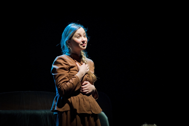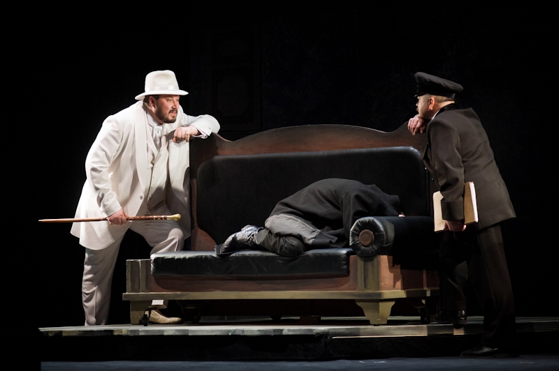 Втиснуть целый талмуд текста в пару часов сценического действия, не растеряв классических монологов про тварь дрожащую, — задача неподъёмная. И Жюгжда, как профессиональный хирург, отсёк всё, что попалось под руку. Первым пострадало преступление — сцены убийства злополучной старухи и её сестрицы в спектакле нет. Алёна Ивановна появляется по ходу действия уже с топором в голове, распевающая старинный городской романс. Выглядит довольно абсурдно и тянет на бред воспалённого мозга, чем, собственно, и является. Зрители методично погружаются в болезненное сознание Родиона Раскольникова — тут и хор убиенных старушек уместен, и летающий Мармеладов логичен, и явление Поленьки Свидригайлову (не во сне, а наяву) тоже не вызывает вопросов.