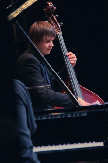 — Как-то так получается, что часть московских музыкантов — это люди, которые приехали завоёвывать Москву. Сегодня я представляю ритм-секцию, который объединил мою судьбу, судьбу харьковского мальчика, с судьбой нашего ударника Давида Ткебучава, который сейчас является одним из известнейших ударников Москвы. Он родился под Кировом, учился в Казани, потом сделал то же самое, что и я, — переехал в Москву, решив, что сможет попробовать себя на более сложном поприще. Примерно такая же судьба у нашего сегодняшнего контрабасиста — он пока что самый молодой участник наших сегодняшних абонементов — Сергей Корчагин, ему всего лишь 25 лет. В 19 лет он уехал из родного Челябинска. Я с ним познакомился недавно: при встрече он поразил меня тем, что он с совершенно невозмутимым лицом прочёл ноты достаточно сложной программы без единой ошибки, после чего мы сразу сыграли концерт. Первую часть мы будем играть втроём.