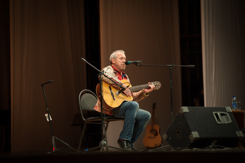 — Бородатый бард с гитарой у костра, поющий социальные песни, — это, конечно же, прошлый век. Мы далеко ушли от того времени, сегодня все обзавелись своими группами или хоть второго гитариста нашли в аккомпанемент. Петь просто под одну гитару позволительно лишь на кухне. Но будем считать, что у нас тут интимная домашняя обстановка. Поэтому вы готовьте серьёзные вопросы, а я пока спою.