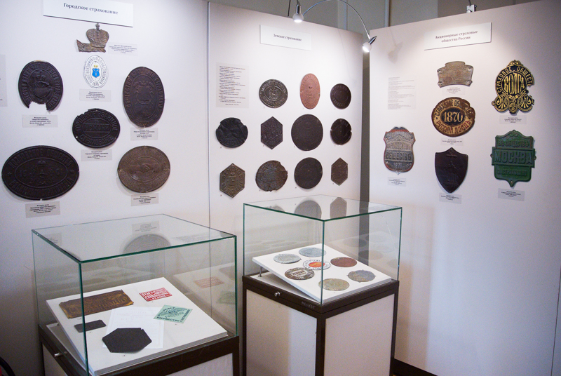 На выставке во Дворце Олега представлено около семидесяти досок из сорока населённых пунктов двадцати регионов страны, наглядно иллюстрирующих историю страхового движения в России вплоть до советской эпохи. Таблички монополии Госстраха вешались на здания и квартиры вплоть до восьмидесятых годов XX века, правда, ни оригинальностью, ни эстетической привлекательностью они не отличались. Зато посетители выставки могут взглянуть на самые старые экспонаты, датированные 1827 годом, и посмотреть на самую редкую доску «Страховое сообщество Русский Лойд» 1870 года. Эта страховая компания просуществовала всего несколько лет, не пользовалась особым спросом у граждан, и её досок сохранилось крайне мало. Своей же любимой Александр называет табличку «В обществе Москва застраховано» 1888-1893 годов, сохранившей оригинальный цвет со времени изготовления. Страховую доску по ошибке прибили к стене дома обратной стороной, так что лицевая поверхность оказалась не тронута ни ржавчиной, ни фасадной краской. По словам Дударева, аналогичные доски встречаются в других коллекциях, но ни одна их них не сохранила свой родной цвет.