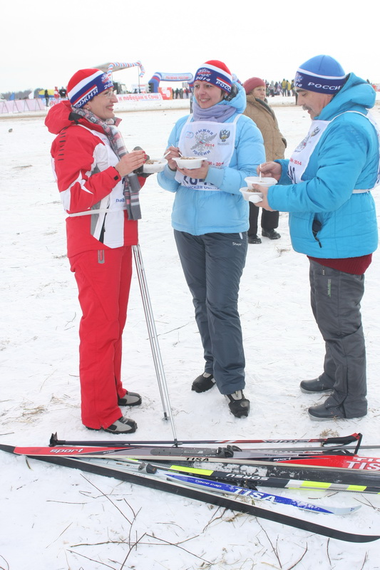 Сигнальная ракета, , взлетела в небо, когда многотысячная лавина уже тронулась в путь: кто на дистанцию пять километров, кто на «десятку». Понятно, что на пьедестал почёта поднялись подготовленные лыжники. Из героев прошлогодних стартов отличились Сергей Чванов, повторивший свою прошлогоднюю победу, Андрей Алипкин, перековавший серебро 2013 года на золото 2014-го, Анастасия Бурмистрова, оформившая серебряный дубль и Татьяна Чванова, которая к золоту на «пятёрке» среди девушек в 2013-м добавила бронзу на женской «десятке» в 2014-м. Призёрами олимпийской «Лыжни России»-2014 стали: