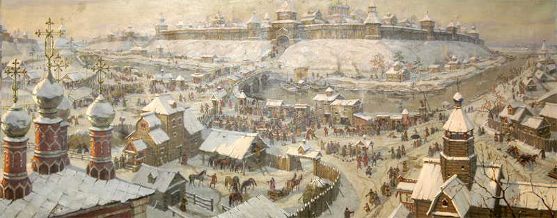 Дальнейшая часть лекции была посвящена Верхнему посаду к западу от кремля. В начале XVI века и здесь начинается формирование новых территориальных образований. Два центра: кремль и Архиерейская слобода, начали расширяться навстречу друг другу. Из кремля поселения выселялись туда, где сейчас современная Соборная площадь. В этом направлении движется кремль, а навстречу... Видимо, в какой-то момент архиерейская слобода перепрыгнула через грандиозный Борисоглебский овраг, который тянулся от храма до площади Маргелова в сторону площади Ленина (этот овраг только в XIX веке смогли засыпать), и начала двигаться в сторону кремля.
