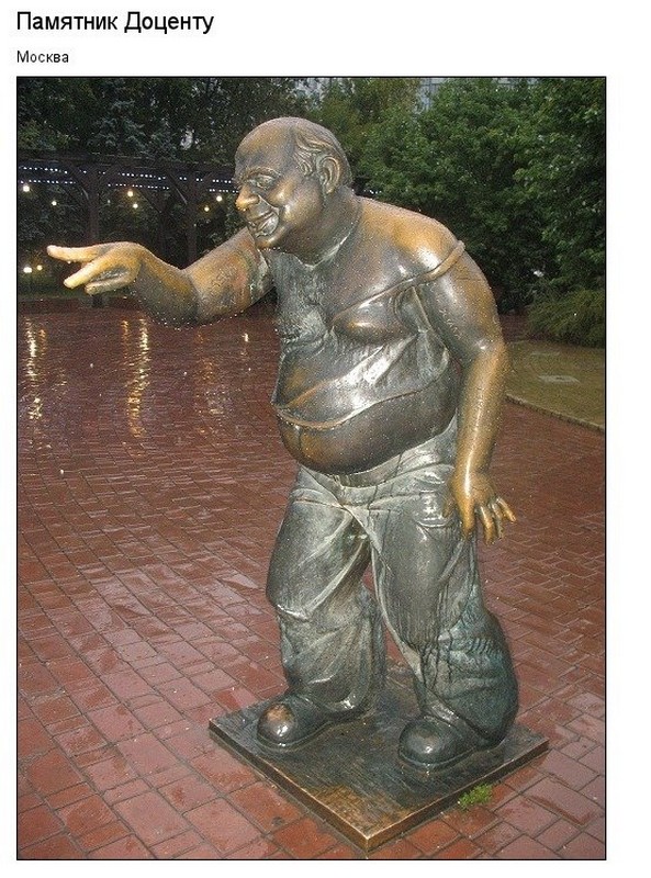 Благодаря этим людям сегодня, изучая разнообразные городские бренды, мы гордимся, что среди них есть и Рязань. Необычные памятники запоминаются и привлекают внимание. Например, на просторах Финляндии стоит самовар, в Екатеринбурге есть памятник культурной собаке, на набережной Днепра имеется скульптура двух колобков — мальчика и девочки, при въезде в почти рязанские Луховицы можно наткнуться на памятник огурцу, Ростове-на-Дону гордится памятником «Нахалёнок и гуси», в Томске установили памятники любовнику и счастью, в центре Праги трудно не заметить увековеченный восточногерманский автомобиль Trabant, в белорусском Гродно (Беларусь) есть бронзовая скульптура автозаправщика, а в узбекском Андижане — памятник чайнику, в Китае возвели гигантскую статую Мэрилин Монро, в Витебске и Анапе увековечили доктора Айболита, в Стокгольме — Карлсона, в Покрове — шоколад, в Йошкар-Оле — йошкиного кота, а в Москве — комического героя Доцента.
