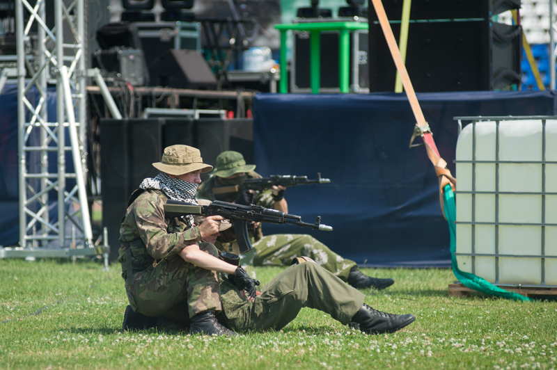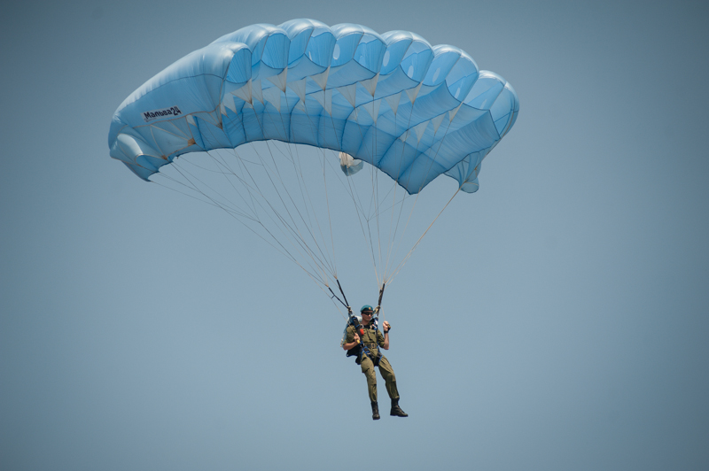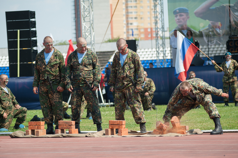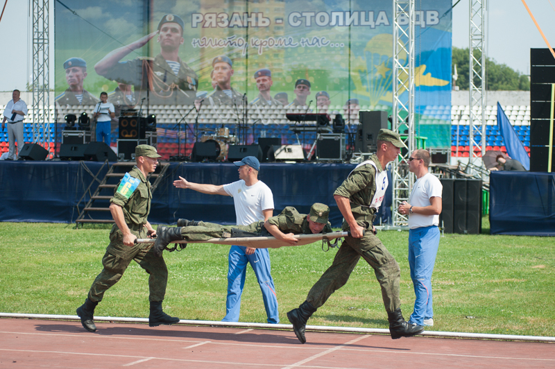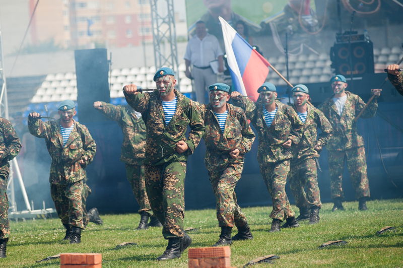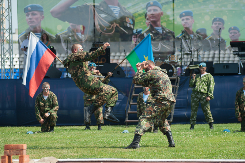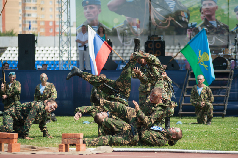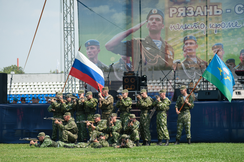 Ключевым же моментом мероприятия традиционно стало торжественное десантирование флагов России, ВДВ, Рязанской области и Рязани на ЦСК силами лучших воспитанников десантного училища. Впрочем, военно-патриотическая часть праздника тоже не осталась без нововведений. Место действия показательных выступлений (на этот раз по обезоруживанию предполагаемого противника и захвату высокопоставленного лица) переместилось с дальней части стадиона на пространство перед сценой поближе к публике. Особенно это понравилось самым маленькими зрителям, которые успели по окончании выступления, не дожидаясь финала мероприятия, собрать все стреляные гильзы. Ребята набрали сувениров, а заодно очистили беговые дорожки стадиона перед проведением обязательной военизированной эстафеты, победителем которой стала команда 137-го гвардейского парашютно-десантного полка. В финале праздника прошёл концерт нового состава популярной группы «Земляне».