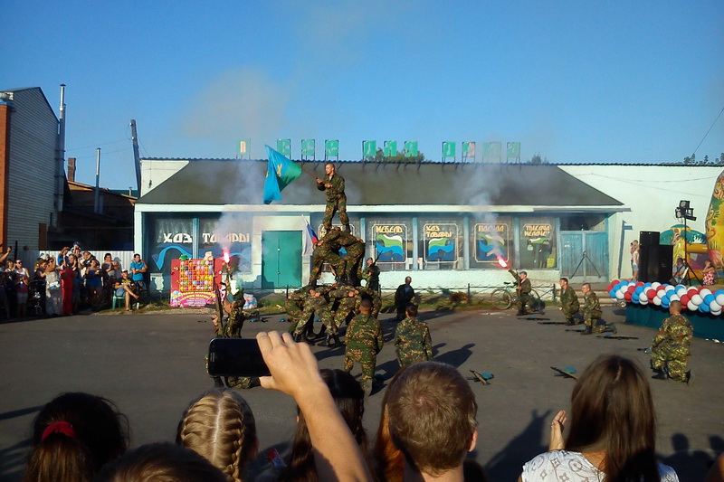 Приглашение было принято: вечером людей на главной площади Тумы стало ещё больше. Сначала последовала радостная весть, что футбольная команда посёлка обыграла своих соперников из Сасово в рамках чемпионата Рязанской области. Когда же на площади появились десантники, восторгу тумчан не было предела. «Голубые береты» произвели форменный фурор демонстрацией приёмов рукопашного боя, стрельбой из автоматов и пулемётов, дымовыми шашками. Зрители после выступления долго не отпускали воинов: разглядывали оружие и фотографировались с десантниками. После выступления десантников убирать площадку от гильз не пришлось: всё подобрали местные мальчишки и девчонки. Программу продолжило выступление артистов Клепиковского районного Дома культуры. Песни сменялись танцами, зрители танцевали, подпевали и благодарили артистов своими аплодисментами.