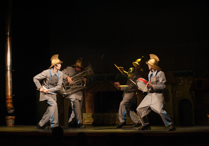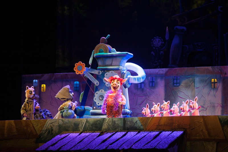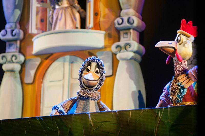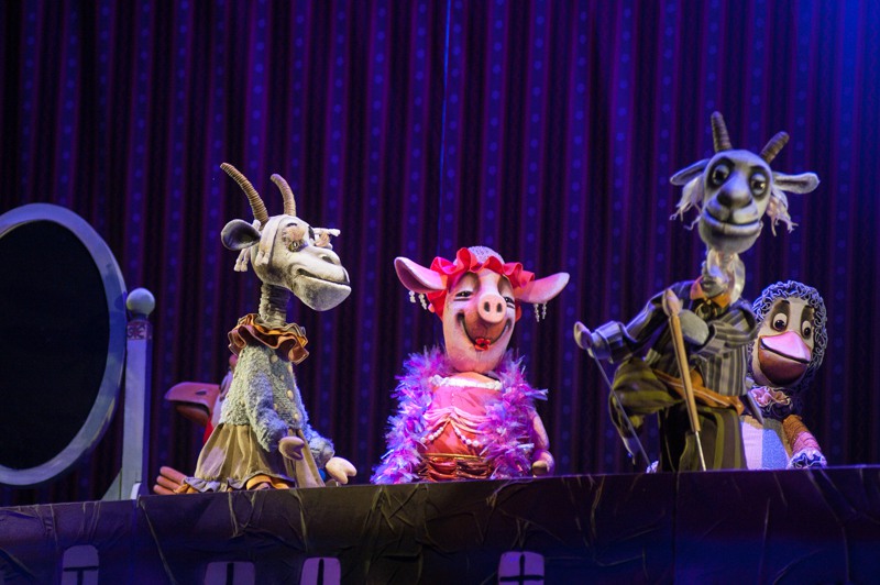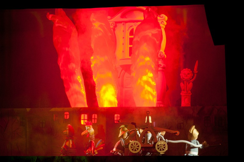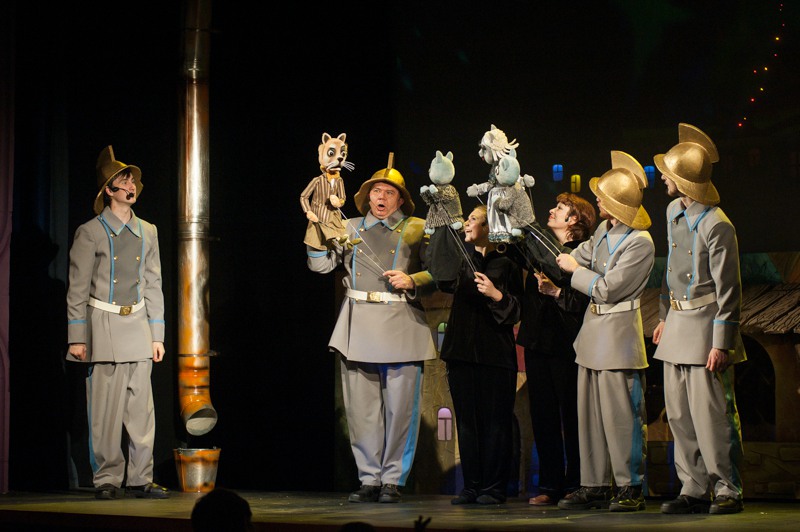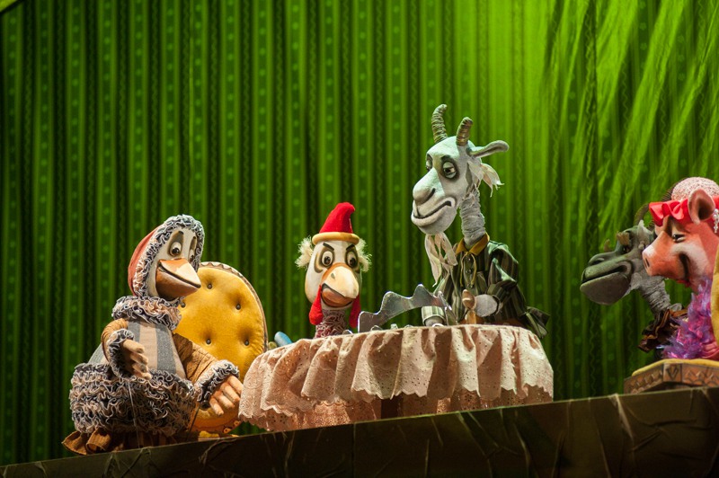 Посреди технических изюминок оказалась не забыта и актёрская игра — каждый из многочисленных персонажей сказки вышел со своим уникальным характером, каждая из искусно сделанных кукол обрела свою минуту славы на сцене. Свинья, как и положено, закидывает ноги на стол, козёл ест герань и играет в карты с козой, цыплята задирают друг друга, поросята танцуют у кормушки, курица несёт яйца… В спектакле задействована чуть ли не половина труппы театра, причём дебютанты играют на равных с корифеями. Кстати, о новичках — монтажёр сцены Родион Горбунов лихо переквалифицировался в артисты-кукловоды и с равным азартом исполнил роли Пожарного и Петуха, юная актриса Анна Лисина засветилась в роли маленького Котёнка.