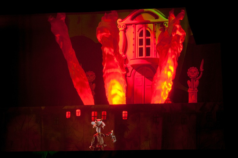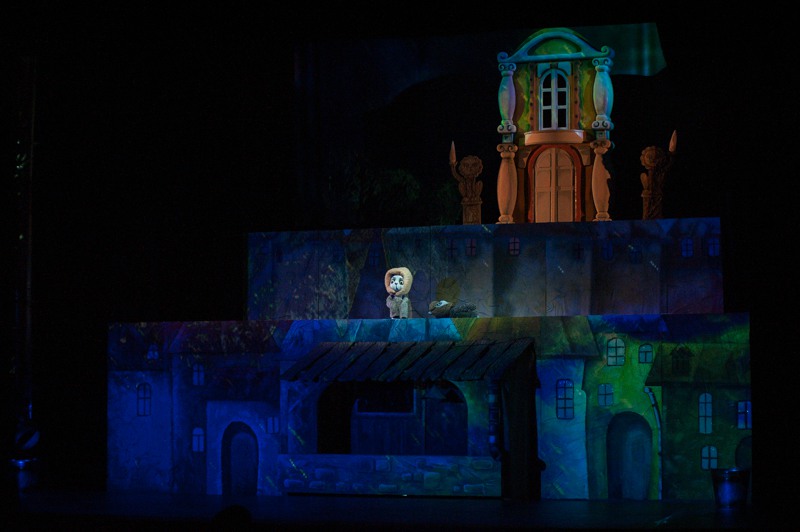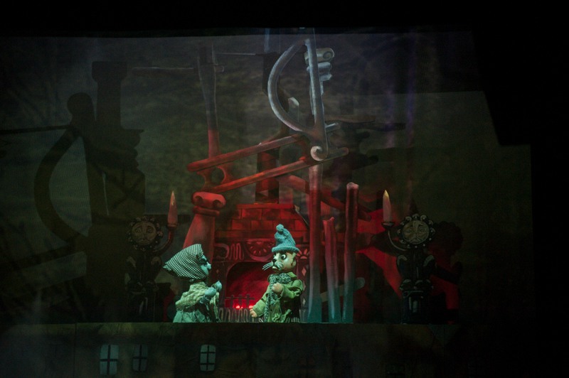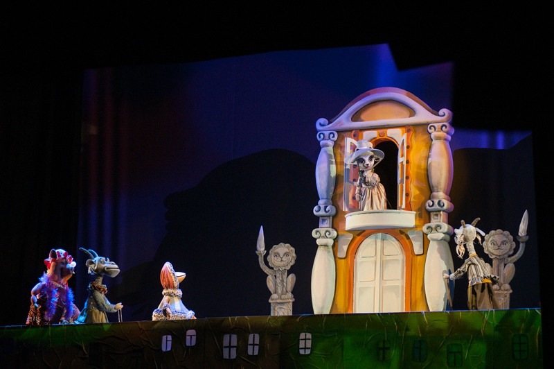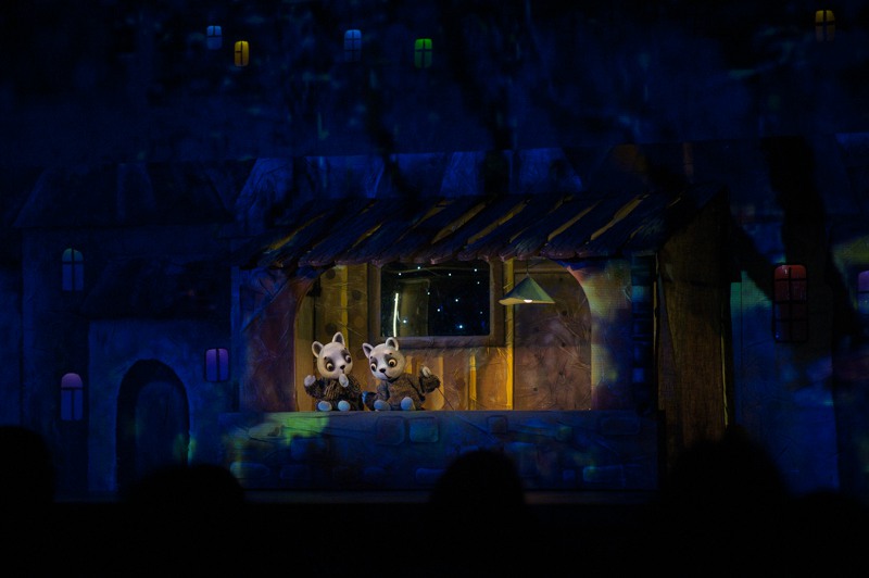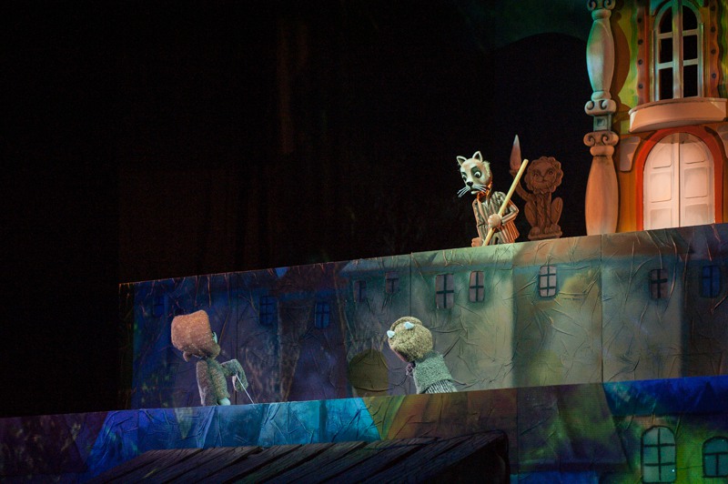 Премьера «Кошкиного дома» пройдёт на большой сцене театра 3 декабря. Накануне важной даты кукольники устроили закрытый показ для своих друзей и журналистов. Зрителей встретил целый город, возведённый под светом рампы. Действие социальной мелодрамы разворачивается сразу в трёх плоскостях: элитный особняк манерной кошки — под самыми софитами, подвал с котятами — на сцене, домики сказочного сообщества — посередине. Вслед за сюжетом зритель карабкается или падает по этой социальной лестнице. Масштабные, хоть и лаконичные декорации, выглядящие довольно уныло перед началом действия, буквально оживают под сценическим светом. Одна за другой тут появляются роскошная гостиная кошачьего дома, зажиточные домики семейки козлов или многодетной свиньи, бедный, но уютный подвал сироток-котят, тёмная холодная улица с огоньками горящих окон. Вместе со сменой сценической географии меняется и погода — благодаря спецэффектам сцену то заливает дождь, то засыпает мокрый снег, то героев сдувает шквальным ветром. Переломным моментом является пожар, буйство стихии показано на удивление реалистично и неожиданно (для детского спектакля) грозно.