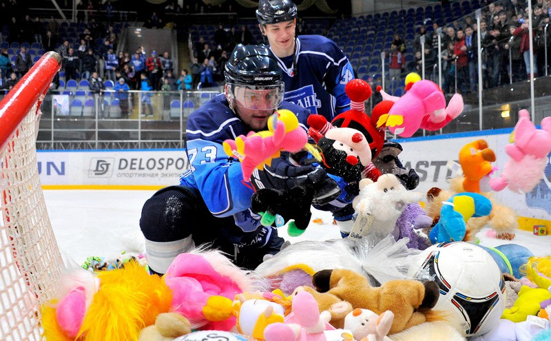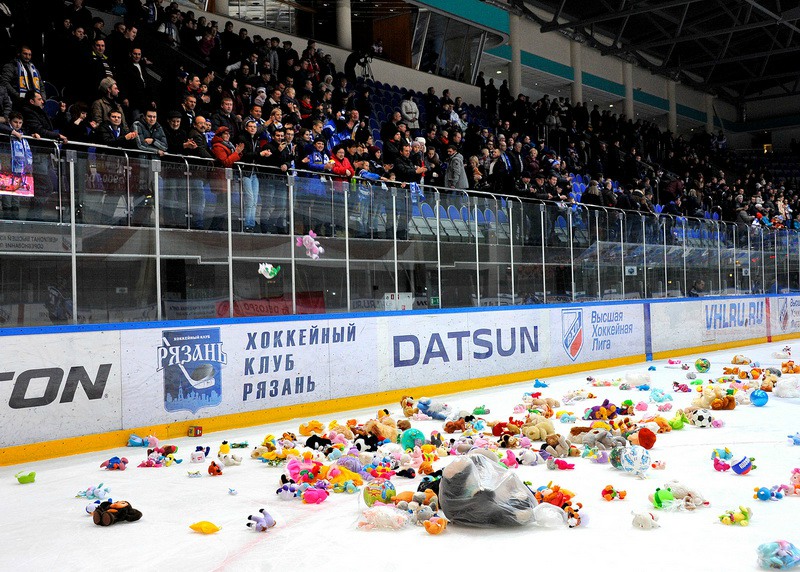 Сразу после финальной сирены, зафиксировавшей победу ХК «Рязань» со счетом 3:2, на лёд под овации трибун полетели мягкие игрушки и мячи — добровольцам из состава «рязанцев», что вызвались собрать это море подарков, пришлось немало потрудится: они с трудом уместились в пару перевернутых хоккейных ворот!