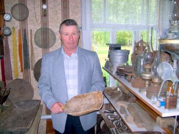 В «Русской избе» собрано более трехсот экспонатов XVIII — середины XX столетия. Здесь и орудия крестьянского труда, и изделия местных ремесел, вещи домашнего обихода. Представлены кухонная утварь, старинная одежда, кузнечные, сапожные инструменты, колодки, раскатки, рубели и другие приспособления для изготовления валенок. На видном месте стоит большой ткацкий стан, сделанный когда-то мастеровым Иваном Филипповичем Лукашкиным, представителем династии деревенских плотников. На добротном буфете местной работы лежит его паспорт. Рядом старинная гармошка лучшего гармониста села П.С. Лапшова, которая так веселила молодежь на деревенских гуляньях. А вот патефон с пластинками. Все работает. Пока Александр Николаевич крутит заводную рукоятку инструмента и ставит пластинку, из библиотеки, расположенной в соседней комнате, выходит его жена Любовь Петровна Журавлева. Она специалист по клубной работе, всю жизнь была художественным руководителем сельского Дома культуры. Показывает аккуратно развешанную одежду возле заправленной деревенским лоскутным одеялом кровати.