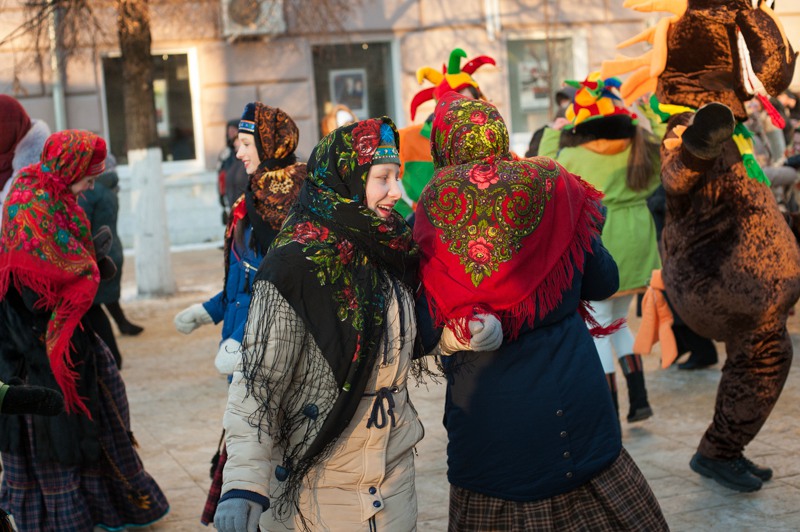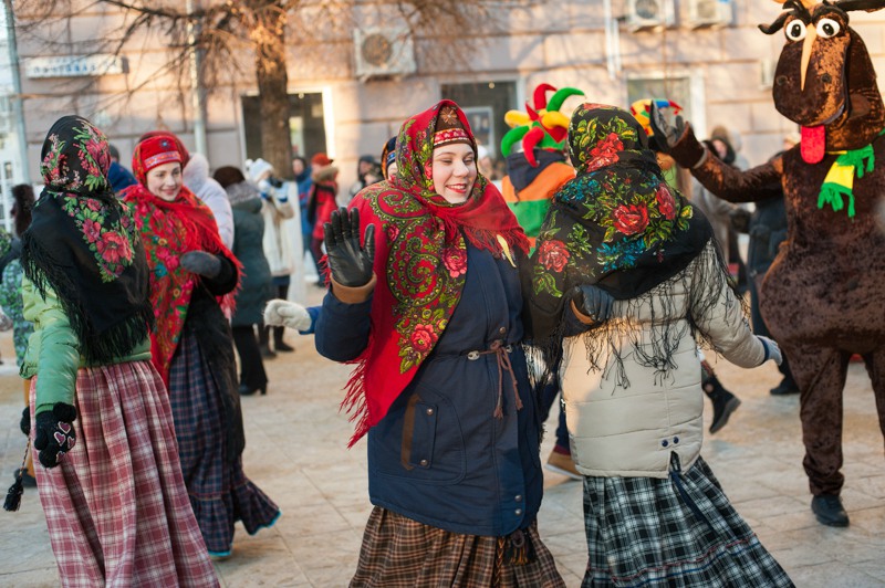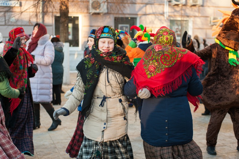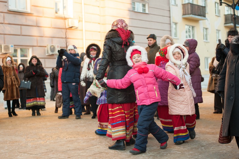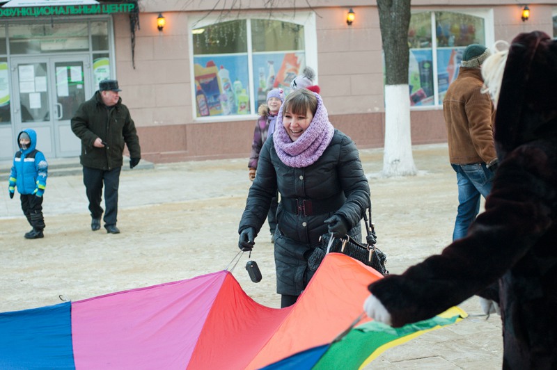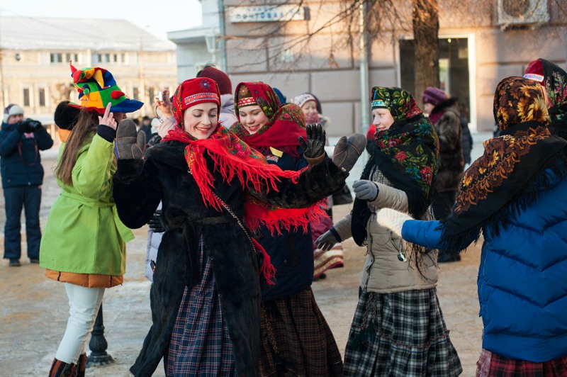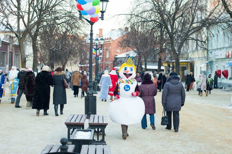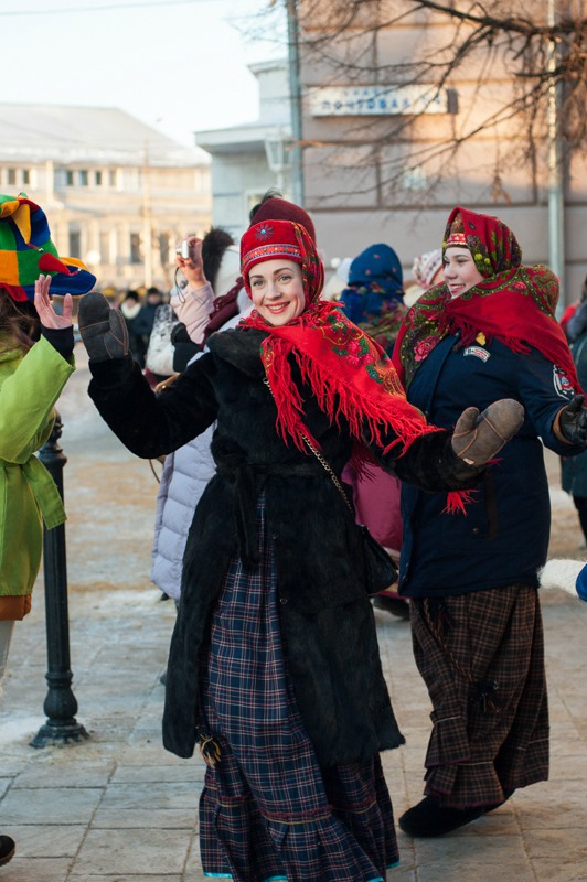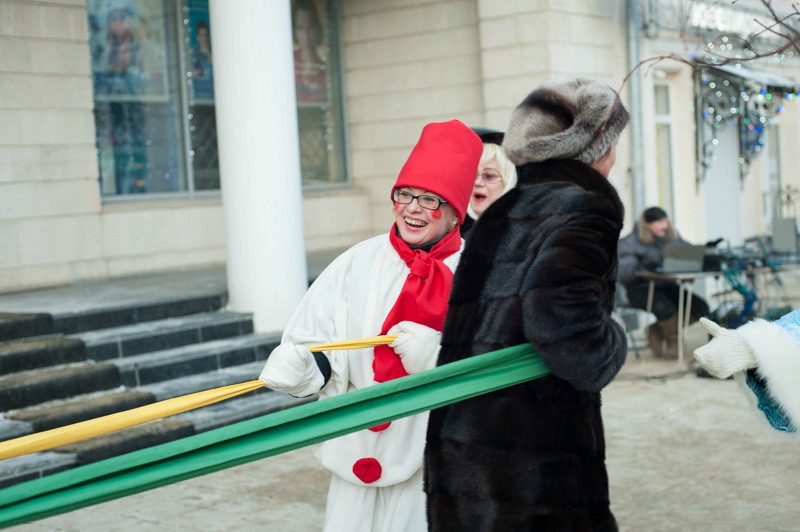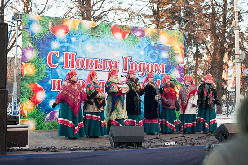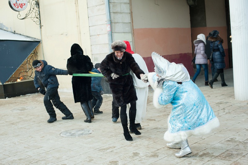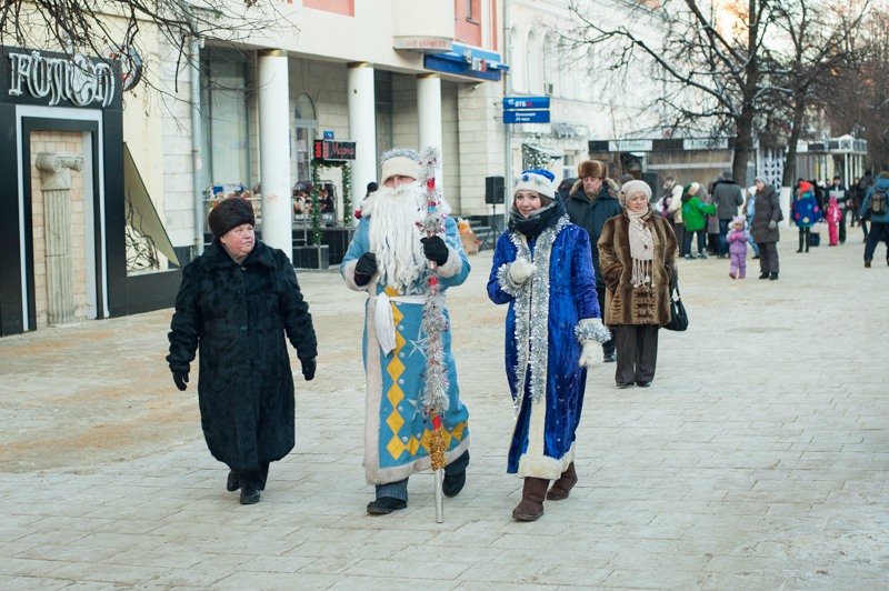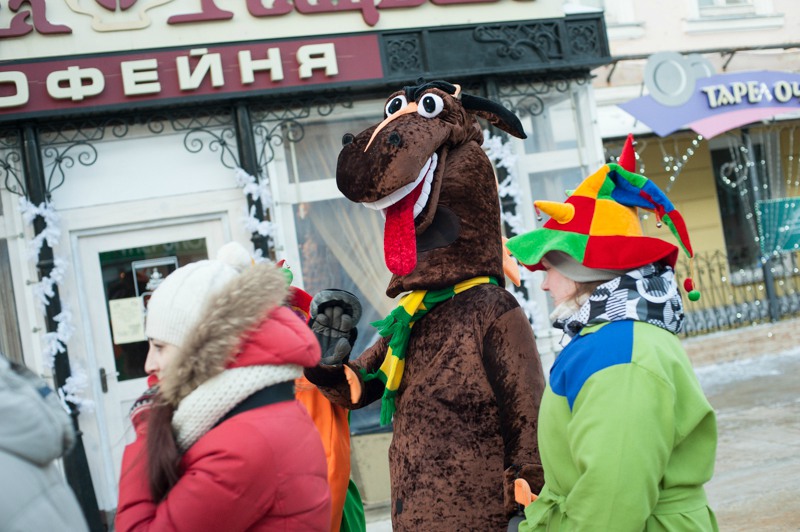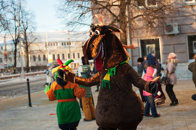 Зато праздничное настроение создавала яркая гирлянда из флажков, натянутая через всю улицу. Ангелов на Почтовой тоже отчего-то не оказалось, зато в изобилии наблюдались Деды Морозы и Снегурочки. Центральные новогодние персонажи дефилировали от здания Главпочтамта до главной сцены у памятника Ленину и высматривали среди редких прогуливающихся горожан детей. По этому же маршруту фланировали ростовые куклы Весёлого Снеговика и Очень Весёлого Коня из модного сказочного отечественного мультфильма. Сии персонажи радостно махали руками и копытами каждому встречному, фотографировались со всеми желающими и регулярно пускались в пляс, чтобы совсем уж не дать дуба. В пляс, кстати, пускались и те зрители, которые решили задержаться на празднике на подольше — других способов согреться в царящие за бортом минус 25 градусов не было. Зато было где потанцевать. Как и положено на народных гуляниях, приоритет был отдан народной музыке — на центральной площадке выступали многочисленные фольклорные творческие коллективы города.