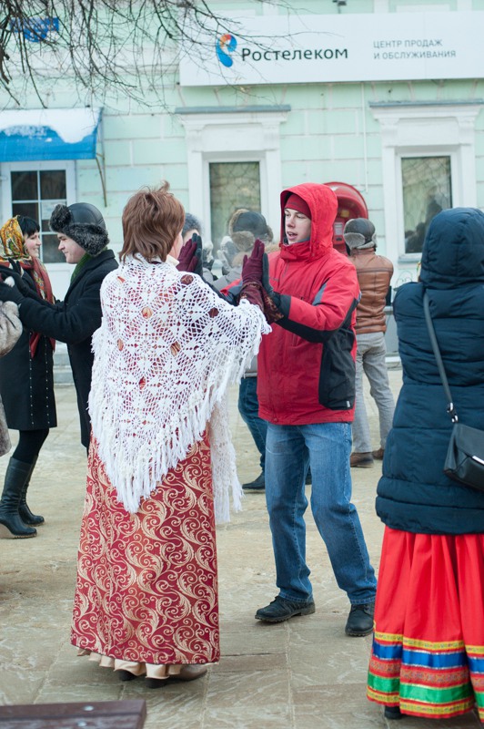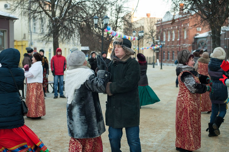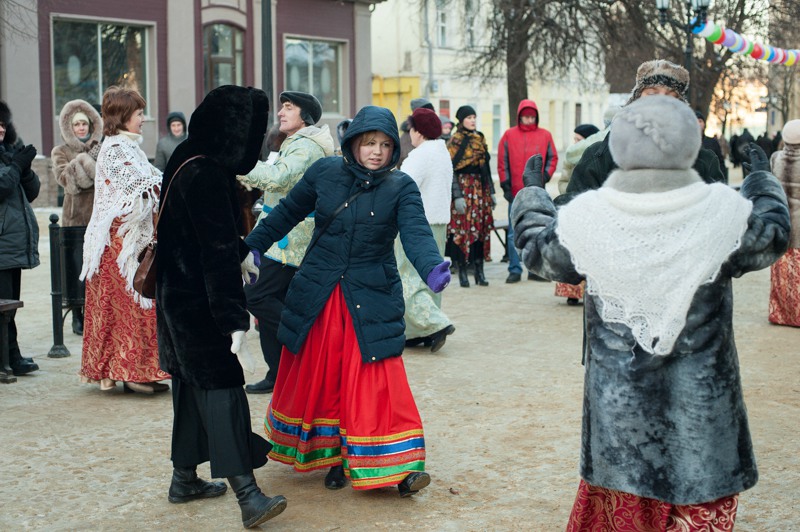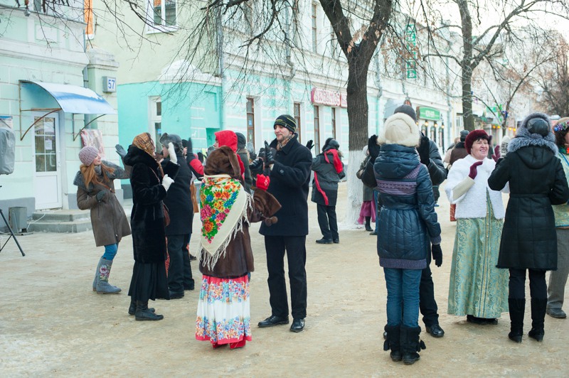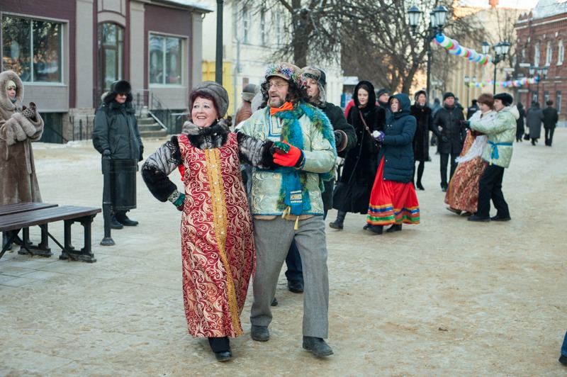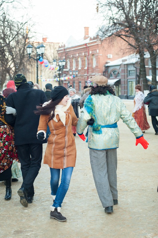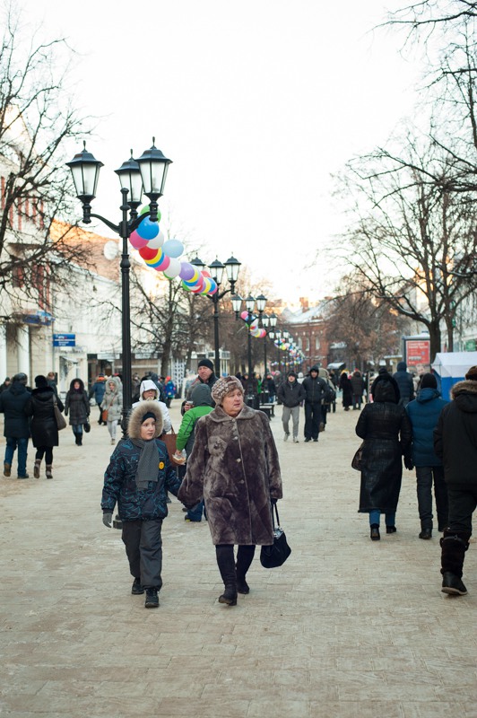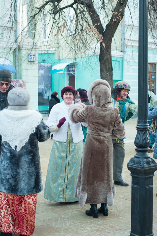 В середине Почтовой обосновались рязанские поклонники исторических танцев из студий «Русский бал» и «Губернский бал» — нарядная компания демонстрировала потрясающую морозостойкость. Впрочем, в Рязани вальсы и кадрили умудряются танцевать вообще в любую погоду: и под дождём, и под палящим солнцем, и когда ртутный столбик термометра уходит в глубокий минус. Против обыкновения зрителей здесь было на порядок меньше, чем участников, да и те тоже быстренько отправлялись учить основные танцевальные па, чтобы хоть как-то взбодриться и не примёрзнуть к модной тротуарной плитке.