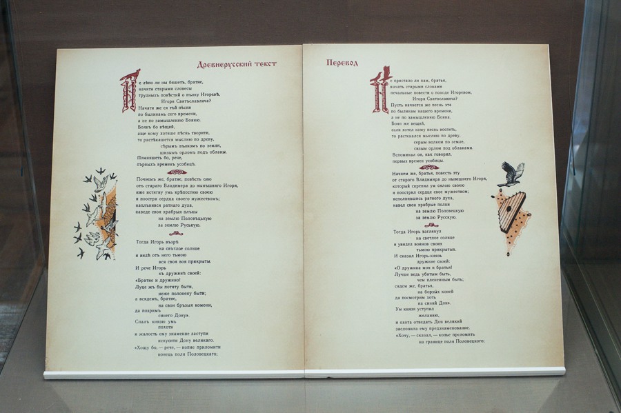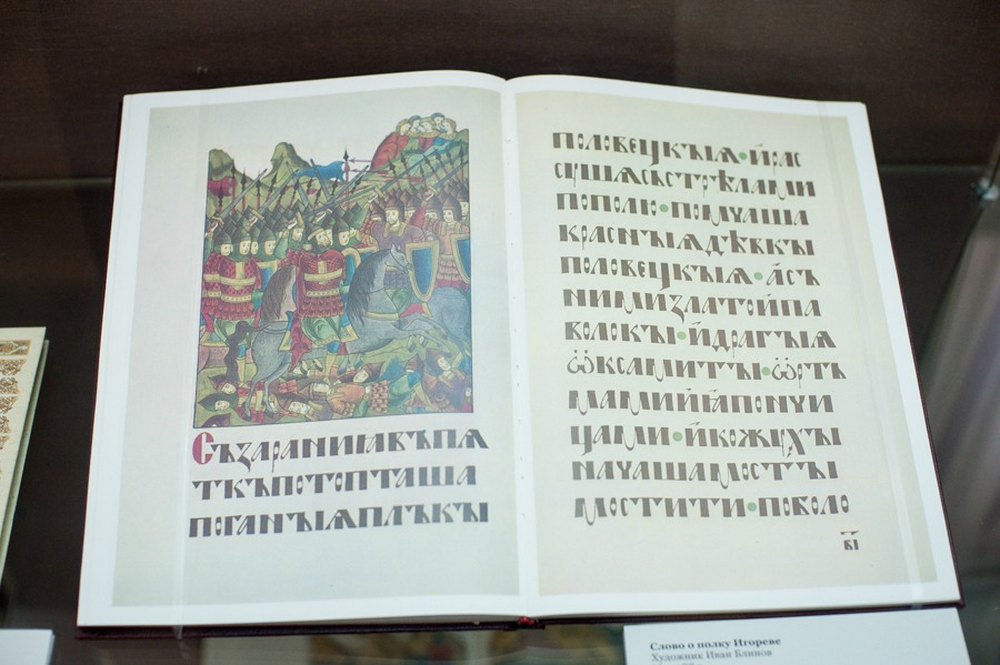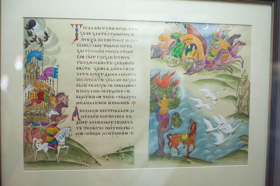 Несмотря на солидный возраст, беспрецедентную авторитетность и сотни научных работ отечественных и западных исследователей «Слово о походе Игоревом, Игоря, сына Святославова, внука Олегова» до сих пор таит в себе множество загадок. Исторически рукопись связана с именем екатерининского вельможи, графа Алексея Мусина-Пушкина, который в конце XVIII века приобрёл сборник летописных текстов с текстом «Слова» из собрания ярославского Спасо-Преображенского монастыря. Однако книга погибла в московском пожаре 1812 года и позднейшим исследователям остаётся лишь гадать о её подлинности. По сей день отдельные учёные с пеной у рта спорят, является ли «Слово» настоящим документом или умелой мистификацией находчивого собирателя древностей. Выставка, экспонирующаяся сегодня в Рязанском кремле, ответ на этот вопрос не даёт, но подробно знакомит зрителя с историей обретения и популяризации уникального произведения. В выставочном зале можно взглянуть на копию письма Мусина-Пушкина, в котором тот сообщает о приобретении сборника со списком «Слова». Есть тут и его первое печатное издание 1800 года, и последующие тиражи 1915, 1988, 2010-х годов. История неудачного похода на половцев, предпринятого новгород-северским князем Игорем Святославичем в 1185 году остаётся актуальной уже который век. Она же продолжает волновать многочисленных художников — на выставке представлено множество иллюстраций разных авторов, выполненных в технике ксилографии, офорта, палеха и акварелью на бумаге… Вместе с оригинальными иллюстрациями можно увидеть и красочные развороты самих изданий.