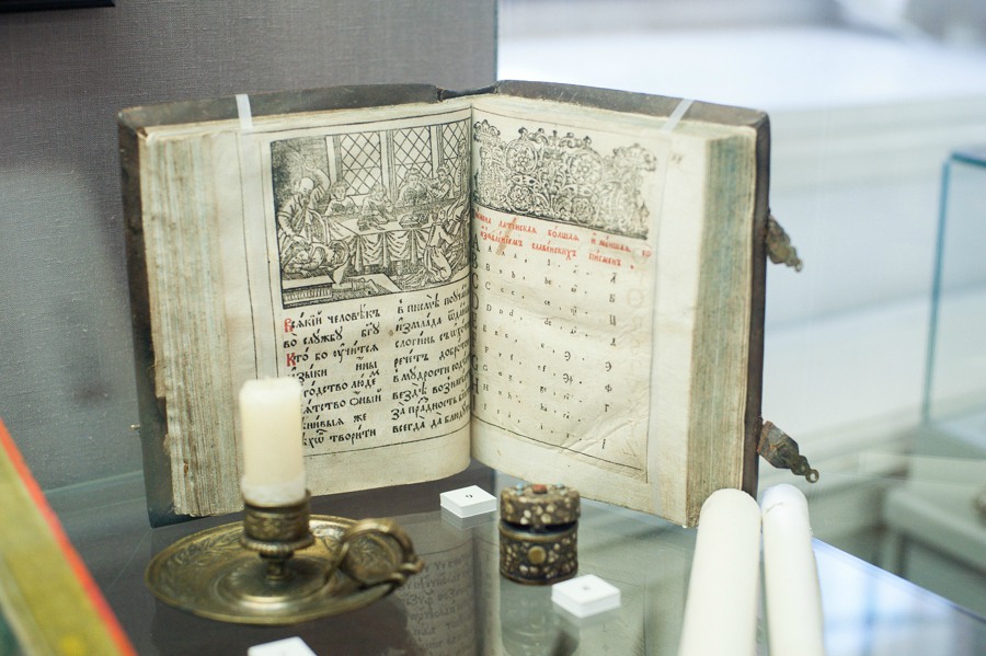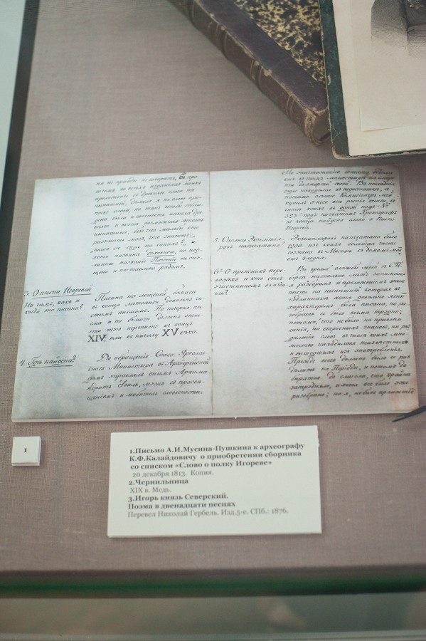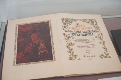 Часть экспозиции знакомит зрителя с эпохой написания и обретения «Слова» и атмосферой, складывающейся вокруг книжного дела на Древней Руси. Множество предметов показывают убранство рабочего стола вельможи — чернильницы, перья, подсвечники, ножницы и прочие канцелярские принадлежности. Заглянуть вглубь веков помогут старинные книги — Евангелие в богатом переплёте 1744 года, акварельные копии лицевого летописного свода XVI века и многие другие. Зрители могут оценить и резную доску, с которой печатались первые русские книги — текст на ней вырезан в зеркальном отображении, буквы и узоры раскрашивались разными красками, а сделанные вручную оттиски на бумаге сшивались в толстые фолианты.