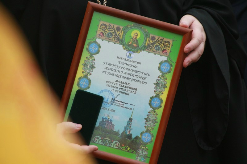 Рассказала настоятельница монастыря и о том, что на пожелание поставить памятник Феофану Затворнику, люди откликнулись сразу же. Скульптором выступил Сергей Резепов. Все, кто был задействован в установке памятника, были награждены медалью Феофана Затворника, учреждённой епархией в юбилейный год. Игуменья же Вера (Татьяна Анатольевна Ровчан) награждена медалью святой блаженной Любови Рязанской второй степени.