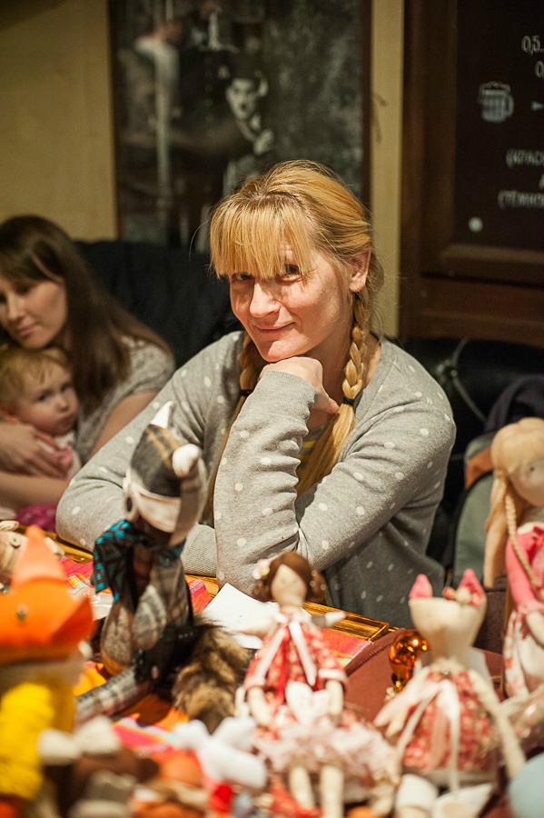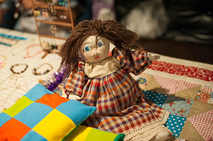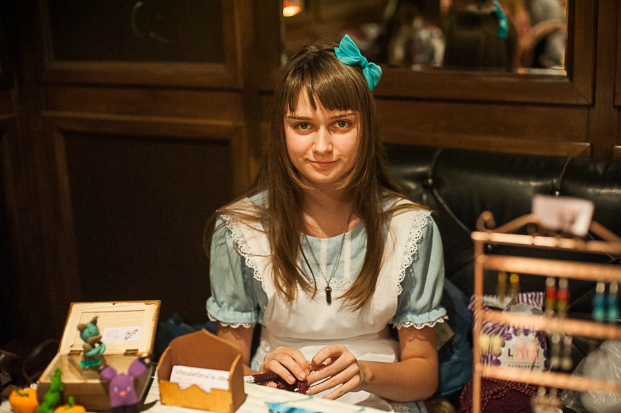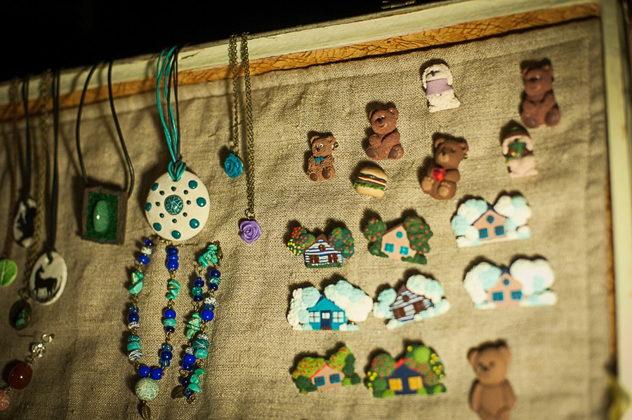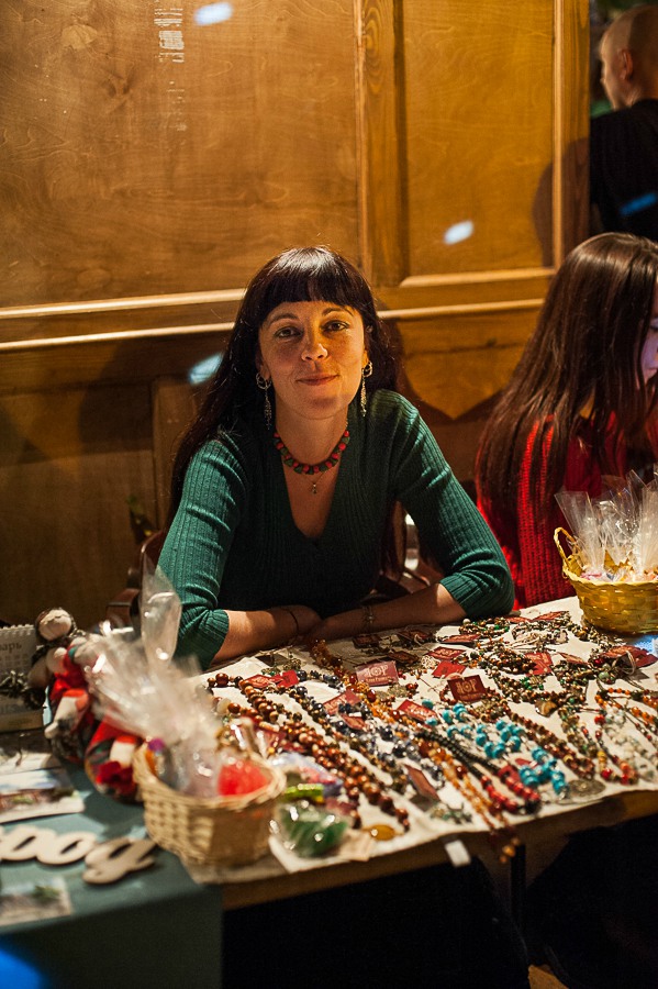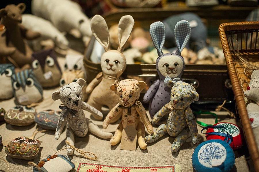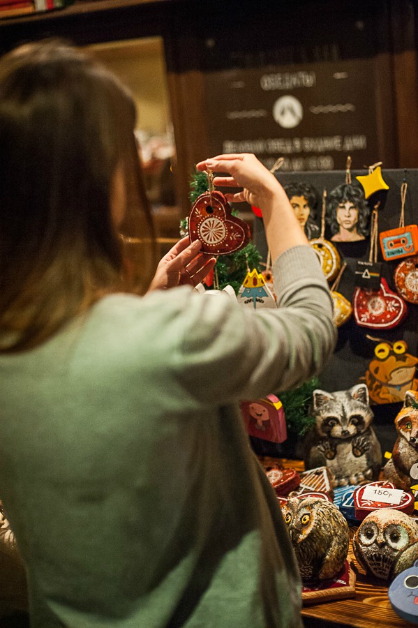 Первым делом на Крафт Маркет (и подобные ему мероприятия) народ идёт ради тусовки и атмосферы. Увидеть старых знакомых, выпить горячего чая или холодного пива за барной стойкой, себя показать и на людей посмотреть — на ярмарках традиционно собираются свои по духу гости и участники. Предстоящий Новый год и рождественские праздники лишь подхлёстывают пеструю и шумную компанию. Местные обитатели не любят стандартных подарков и не привыкли хватать с магазинной полки первый попавшийся блокнот для приятеля или скучную чашку для мамы. Напротив, все они готовы охотится за сюрпризами для своих любимых, по десятому разу обводить взглядом старый чемодан с рукодельными игрушками, чтобы среди вороха мишек и зайцев найти того единственного, который непременно обрадует будущего владельца. В плане выбора подарков на любой вкус, цвет, размер и кошелёк Крафт Маркет не подкачал. От затейливых кожаных брелоков или крохотных — с ладошку — текстильных мишуток (до 300 рублей) до рукодельных шерстяных шапочек-шарфиков или украшений из натуральных камней (за пару-тройку тысяч деревянных). Впрочем, ценность Крафтовых подарков не в их малой или большой стоимости, а в тепле авторских рук и абсолютной уникальности.