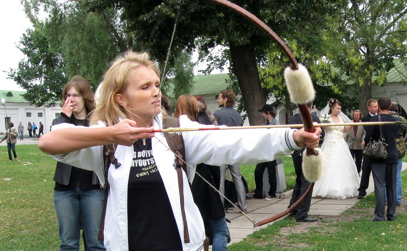 Кстати, запастись едой в такой день не помешает, ведь «Переяславльская потеха» рассчитана на целый день. Если не стесняться, то можно стать героем в соревнованиях на меткость, силу, прыткость и гибкость, а если не лениться, то и профессионалом. Например, я со стрелой, тетивой и луком справилась сразу, и попала в цель с пятой попытки.