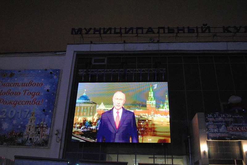 С этого же экрана участники праздника наблюдали итоги акции «Поймай Деда Мороза», проведённой в городе за несколько дней до Нового года. Рязанцев поздравили с праздником сначала обычные земляки, а потом и президент РФ Владимир Путин — разумеется, не лично, а посредством большого экрана у МКЦ.