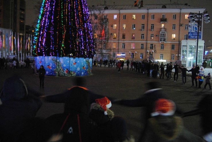 Главная ёлка Рязани собрала на Новый год людей разных национальностей, возрастов и семейного положения. Празднование не обошлось без огромного хоровода и Деда Мороза со Снегурочкой.