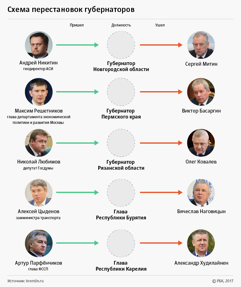 В течение февраля свои посты покинули пять губернаторов: Виктор Басаргин (Пермский край), Вячеслав Наговицын (Бурятия), Сергей Митин (Новгородская область), Александр Худилайнен (Карелия) и Олег Ковалев (Рязанская область). При принятии решения об отставке того или иного главы субъекта учитывалось несколько факторов, рассказал источник РБК в Кремле и подтвердил собеседник, близкий к администрации президента.