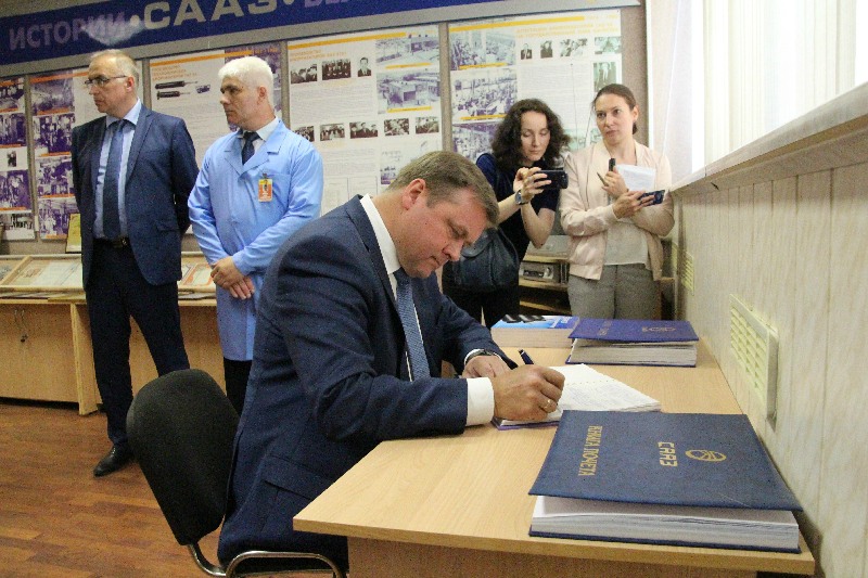 По цехам предприятия главу региона провёл исполняющий обязанности генерального директора Скопинского автоагрегатного завода Юрий Анашкин, который показал механический, сварочный, сборочный цеха, а также музей, где в книге почётных гостей Любимов оставил запись. «Завод — надежда рязанского машиностроения, обладающий как технологиями, так и профессиональным коллективом, способный производить высококачественную продукцию. Спасибо вам за социальное участие в жизни района и города Скопина», — записал он.