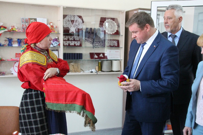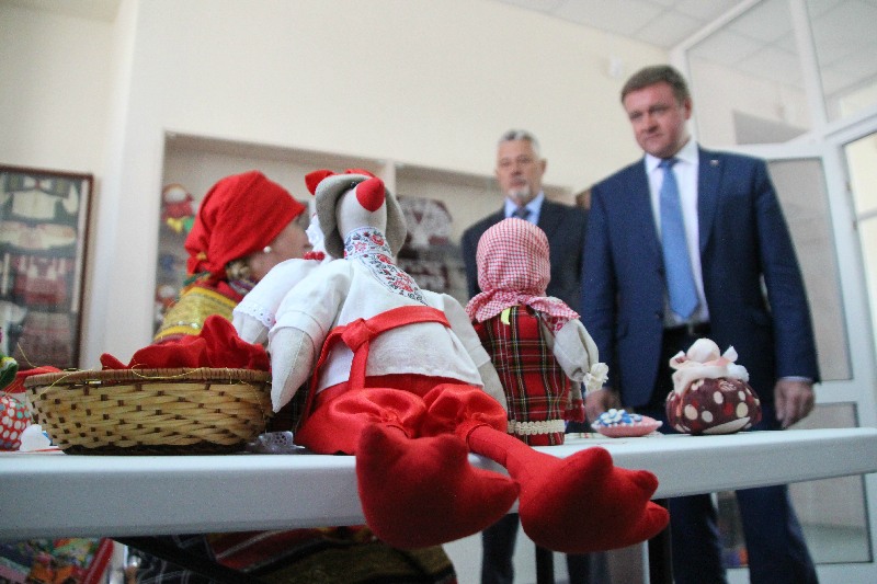 С недавних пор здесь работает и текстильная мастерская, где врио губернатора также встретили не без внимания, предложив поучаствовать в одевании на тряпичную куклу передника. Объяснили, что кукла эта нужна для того, чтобы всегда водился неразменный пятак. Николай Любимов надел передник и пожелал, чтобы неразменная пятитысячная купюра всегда имелась в кармане у каждого.