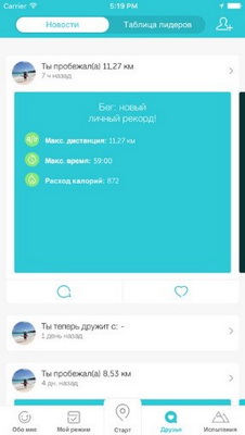 Данное приложение очень похоже на первый пункт в нашем списке. Он также отслеживает темп и дистанцию, выдаёт подробную статистику, считает калории. Кроме того, RunKeeper даёт возможность ставить цели и сравнивать с ними результат. Из преимуществ приложения — наличие голосовых уведомлений уже в базовой версии, которые можно настраивать по множеству показателей: времени, расстоянию, темпу, средней скорости и так далее. Как и другие аналогичные приложения даёт возможность поделиться достижениями с друзьями или бросить им вызов через соцсети.