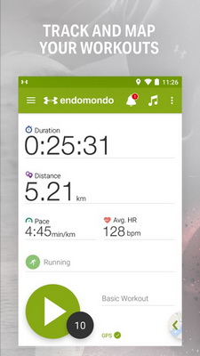Endomondo — первопроходец среди «спортивных» приложений. Он популярен среди активных людей около тридцати лет. По функционалу приложение мало отличается от своих собратьев, но визуально кажется более серьёзным и лаконичным. В бесплатную версию входят персональный дневник тренировок практически по любому виду спорта, голосовое сопровождение, опция «брось вызов» и возможность соревноваться с друзьями, публиковать достижения на Facebook и Google+. Можно выбрать режим для тренировки в зале. В приложении также есть голосовые сервисы вроде личного тренера и возможности подбадривать друзей голосовыми сообщениями, но пока, чтобы воспользоваться ими, нужно знать английский.