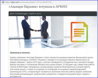 Ассоциация развития финансового рынка оценила заслуги бренда Альпари на белорусском рынке Форекс и приняла компанию «Альпари Евразия» в свои ряды. Решение утвердили 1 марта 2019 года.