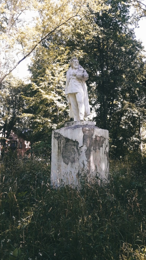 Сразу памятник Чернышевскому : даже жители окрестных домов знают только его примерное расположение. А ведь стоит он в сквере, названный его именем — сквер Чернышевского, по соседству с одноимённой улицей. Сам памятник являет собой жалкое зрелище — время его не пощадило, от былого величия не осталось и следа. А судя по близлежащим останкам огромных вазонов, уже превратившихся в руины, когда-то это было действительно красивое городское место отдыха. Высота монумента — около восьми метров, но со стороны его не видно, он еле просвечивает сквозь заросли деревьев.