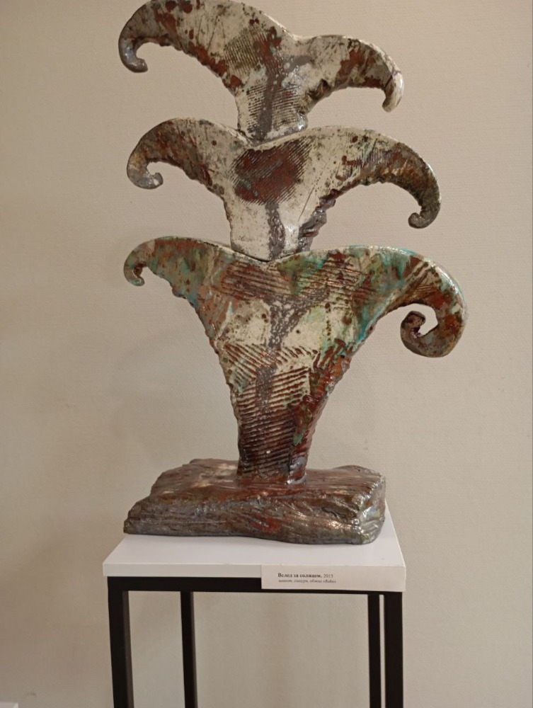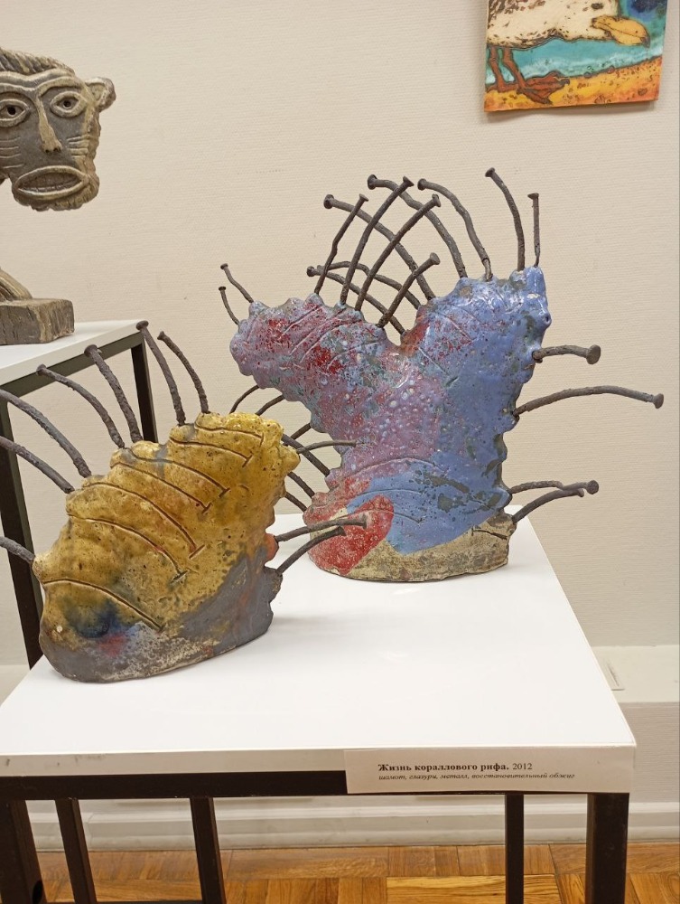 «Самая непредсказуемая моя работа «Жизнь кораллового рифа», - рассказывает художница, - пришла идея использовать в композиции гвозди от старого забора, это первая работа, где я сочетала керамику и металл, вероятно, по всем законам физики гвозди могли бы расплавиться при обжиге, но они не только не расплавились, а приобрели особый оттенок, в итоге появилось очень колоритное произведение».