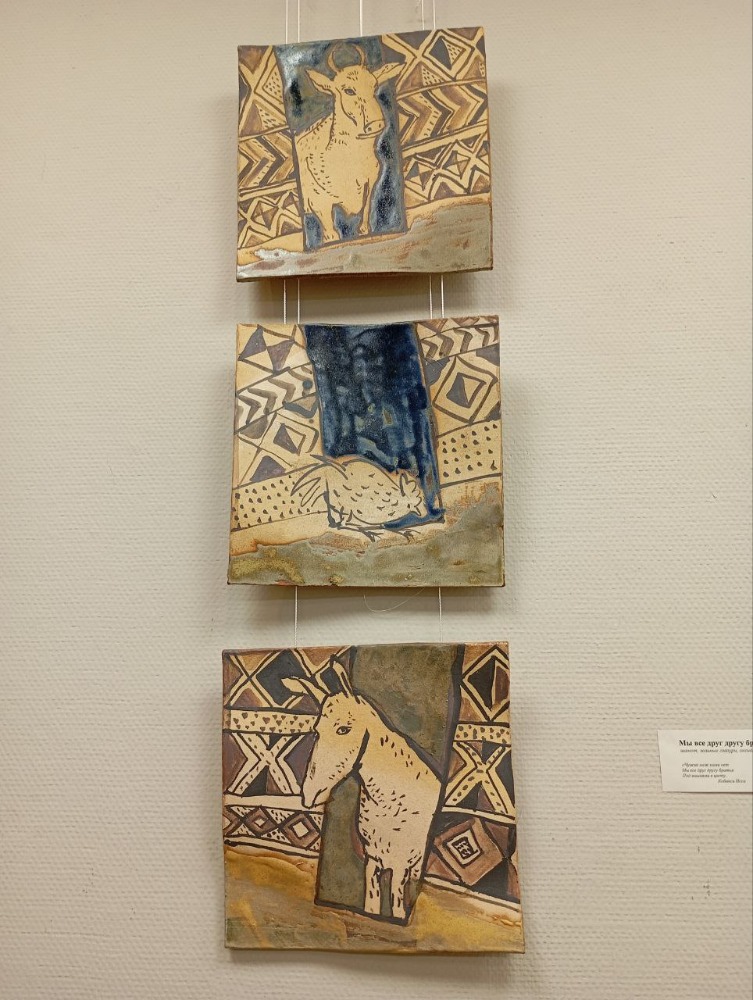 «Мы все друг другу братья» - работа под таким названием представляет серию из изображений домашних животных (бычок, курица, лошадка).