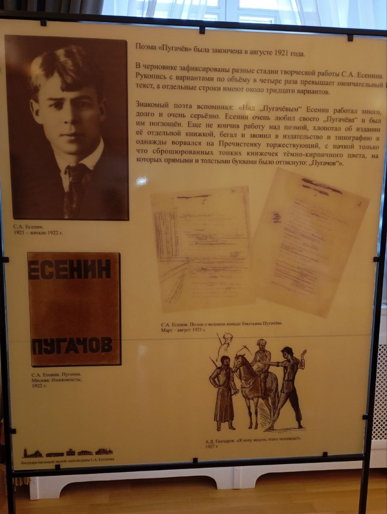 «Пугачёв» — драматическая поэма Есенина, которая повествует о Емельяне Пугачёве, донском казаке, предводителе восстания 1773-1775 годов. Есенинская поэма — это весьма вольная интерпретация исторического образа, но акцент в произведении ставится на личность Пугачёва, которая представлена такой, какой видит её сам поэт. В его представлении Пугачёв — мессия, готовый пожертвовать собой ради блага других. Пугачёв до последнего верил, что мятежники — его единомышленники, но это оказалось ошибкой. Угнетённые крестьяне готовы и дальше угнетаться, только чтобы остаться в живых. В результате мятеж подавлен, Пугачёв схвачен и казнён.
