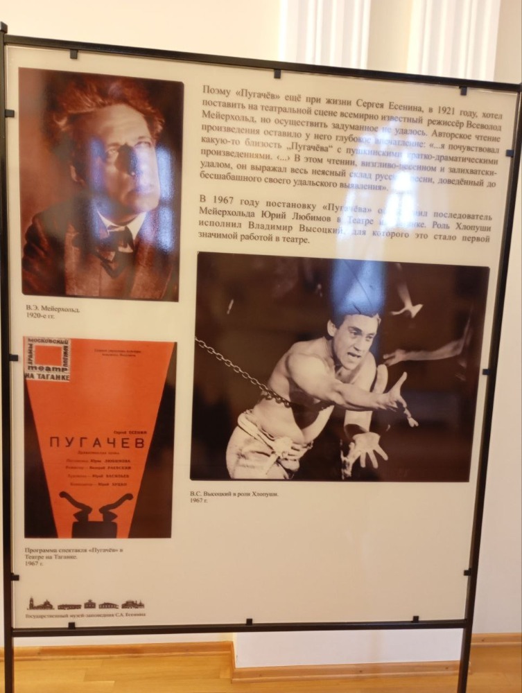 Спектакль идёт без антракта. В фойе театра открыта выставка «Пугачёв: Драматическая поэма» из фондов Государственного музея-заповедника С. А. Есенина. На экспозиции представлены рукописи поэмы «Пугачёв» и издания разных лет, иллюстрации к произведению, афиши, программки и фотографии фрагментов театральных постановок. В том числе отдельный стенд отведён для демонстрации фактов о самой знаковой постановке Театра на Таганке 1967 года, где роль Хлопуши исполнял Владимир Высоцкий.