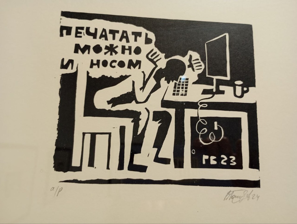 Экспозиция включает в себя работы Владимира Яшке, Василия Голубева, Ирины Васильевой, Александра и Ольги Флоренских, Ивана Сотникова, Андрея Кузнецова и Владимира Шинкарёва. Девизом всей выставки послужила гравюра Василия Голубева «Печатать можно и носом», отражающая по замыслу автора коллекции суть экспозиции.