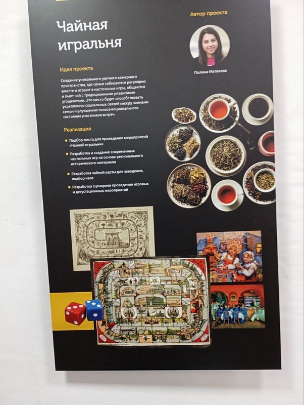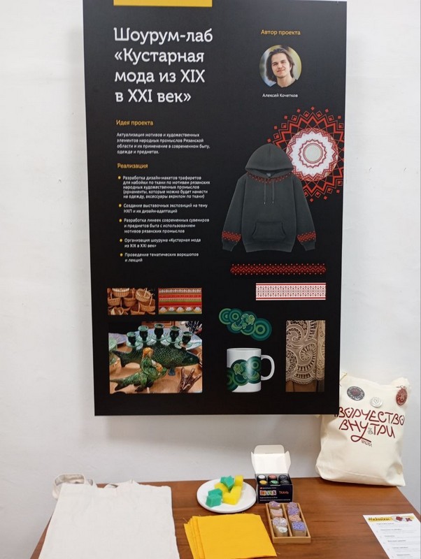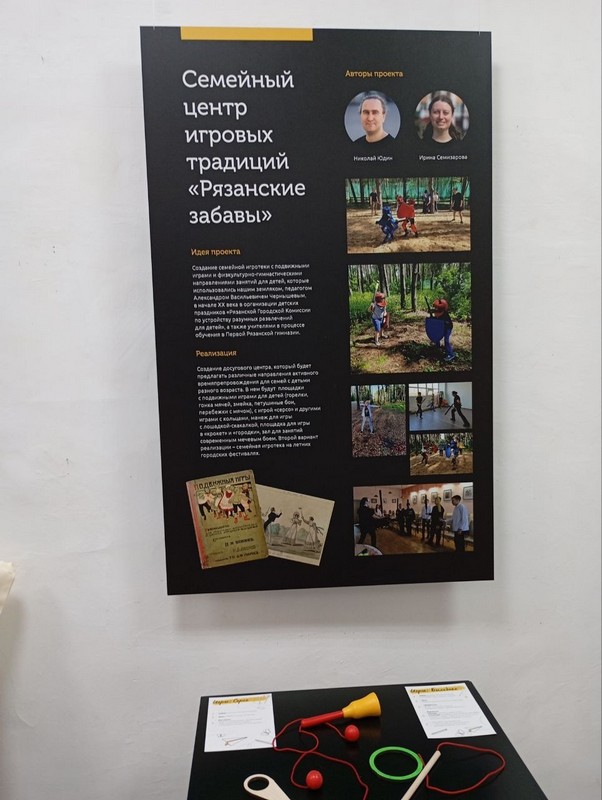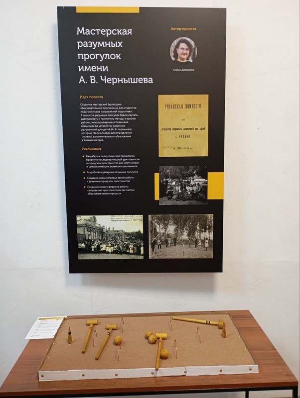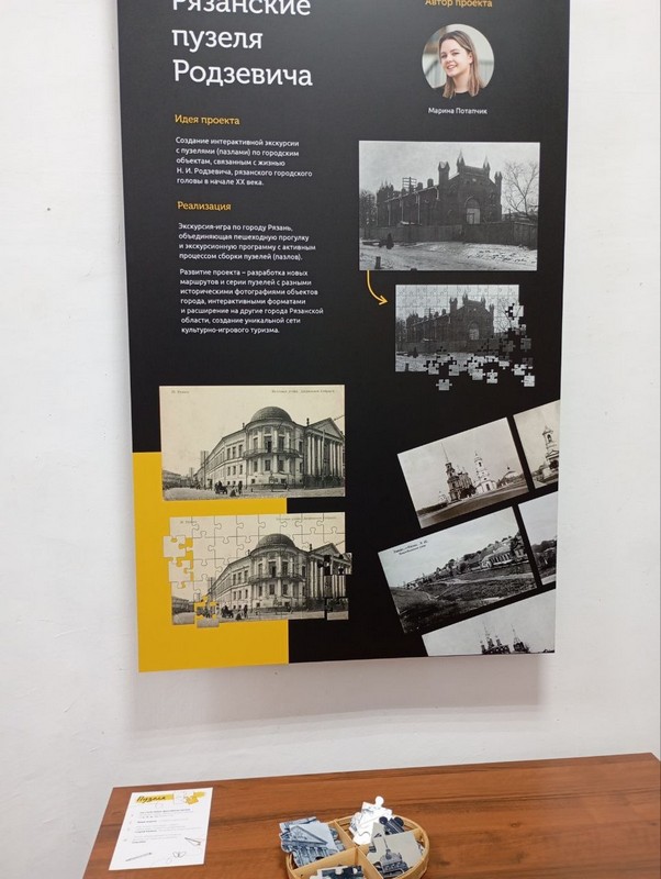 Просмотр начинается с персональной фотовыставки Светланы Крючковой «Закулисье проекта», которая запечатлела все этапы работы «Мастерской». В следующем зале представлены девять проектов «Молодёжной творческой мастерской Родзевича», в которой участвовали 12 человек. Они разрабатывали проекты, основанные на историческом наследии Рязани и Рязанской губернии начала XX века. Участники собственных идей рассказывали о результатах своих работ в реальном действии: можно было поиграть в настольные, и не только, игры («Бирюльки», «Настольный крокет», «Серсо», «Бильбоке»), ответить на вопросы викторины («Фабрика слова»), составить с помощью деталей индивидуальный дизайн, представить себя краеведом, собрать пазл.