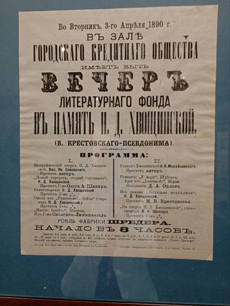 «Хвощинская - прекрасная женщина своего времени, которая рискнула выйти в мир большой литературы, вынужденной публиковаться под мужским псевдонимом «В.Крестовский», - отметил директор РИАМЗ Олег Робинов.