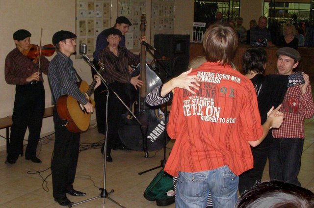 А в антракте народ прямо в фойе развлекал "Парнас". И еще - я подошел к столу, где лежали футболки с картинками, и оказалось, что в бывшем ГСКБ на Есенина можно сделать такие футболки с любыми изображениями (какие принесешь) примерно за 500 рэ.