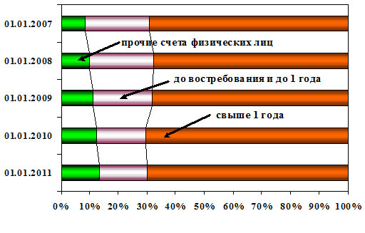 Весь прирост организованных сбережений граждан обеспечен притоком средств на рублевые счета. В условиях укрепления позиций рубля по отношению к доллару США и евро подобная динамика отмечалась в январе-июле, а также в декабре. В прошлом году сохранилась тенденция опережающего роста долгосрочных вкладов населения по сравнению с краткосрочными (132% против 128,7%). Как следствие на депозиты сроком свыше 1 года в конце анализируемого периода приходилось 70% их общей величины. Популярность таких вкладов объясняется возможностью клиентов фиксировать процентные ставки на более длительные сроки в условиях их снижения, отражающего динамику ставки рефинансирования.