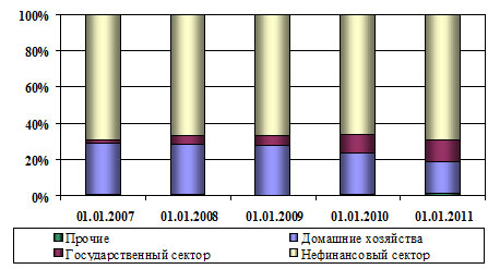 В банковском секторе появились признаки того, что нарастание просроченной задолженности замедлилось. Если в январе-сентябре 2010 годаудельный вес неплатежей в общем объеме кредитов возрос с 3,6% до 5,4%, то в последние три месяца прошлого года наблюдалось его снижение до 5%. В общей сумме просроченной ссудной задолженности неплатежи физических лиц занимали 21%, предприятий нефинансового сектора – 79%. Среди видов экономической деятельности наибольшая просроченная задолженность числилась за организациями оптовой и розничной торговли, ремонта автотранспортных средств (44,6% совокупного объема неплатежей), обрабатывающих производств (17,3%), строительства (12,2%), сельского и лесного хозяйства (11,3%).