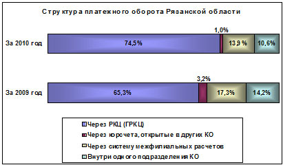 Наметившаяся хозяйственная активность предприятий в Рязанской области позволила восстановить объемы платежного оборота. Ежедневно в банковской системе Рязанской области обрабатывалось в среднем 55 тыс. расчетных документов на сумму свыше 4 млрд. руб. (в 2009 году – 52,5 тыс. на 3,8 млрд. руб.). По сравнению с 2009 годом объем проведенных платежей вырос на 10%, с 2008 годом – на 7%. Большинство платежей по-прежнему совершалось в платежной системе Банка России.