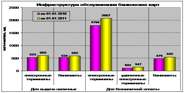 Региональная инфраструктура обслуживания банковских карт на 01.01.2011состояла из 762 банкоматов (в т.ч. 582 было предназначено для получения наличных, 545 – оснащено функцией безналичной оплаты услуг), 2817 терминалов (из них 2214 в торгово-сервисной сети и 603 в пунктах выдачи наличных) и 16 импринтеров в торгово-сервисной сети. Существующая инфраструктура позволяла держателям совершать операции с использованием карт 19 платежных систем, из которых 6 являлись международными.