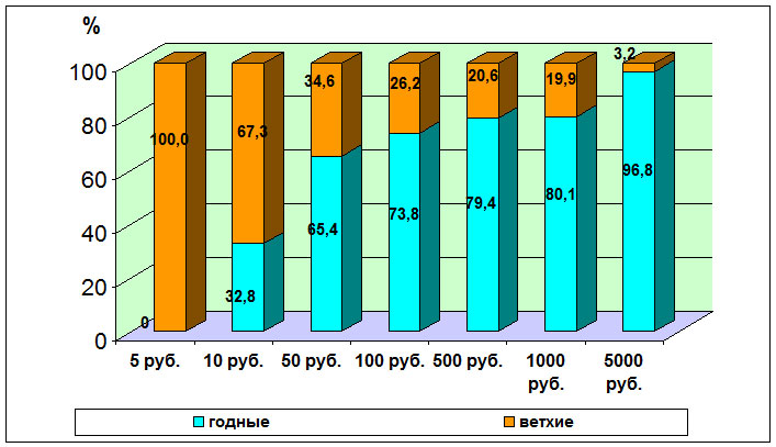 Расчётно-кассовыми центрами проведено 2394 экспертизы платёжеспособности денежных знаков Банка России и 29 экспертиз платёжеспособности денежных знаков иностранных государств (группы государств). В прошедшем году отмечено существенное снижениеколичества подделок, выявленных в банковской системе региона. Выявлено 704 поддельных денежных знака Банка России на общую сумму 788 765 рублей, (в 2009 году, соответственно1057 на 1107 235 рублей), из них 691 банкнота и 13 монет (в 2009 году 1050 и 7).