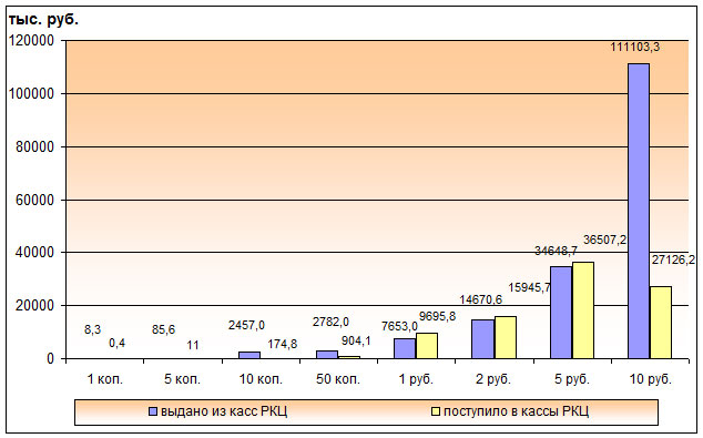 В платежный оборот все больше внедряется монета достоинством 10 рублей. Ее выдача возросла, особенно за последние 3 месяца 2010 года. Так, за 9 месяцев выдачи составили 15 млн. рублей, за IV квартал– 96 млн. рублей. Монеты достоинством1, 2 и 5 рублейв кассы расчетно-кассовых центров Главного управления за 2010 год больше возвратилось, чем выдано.